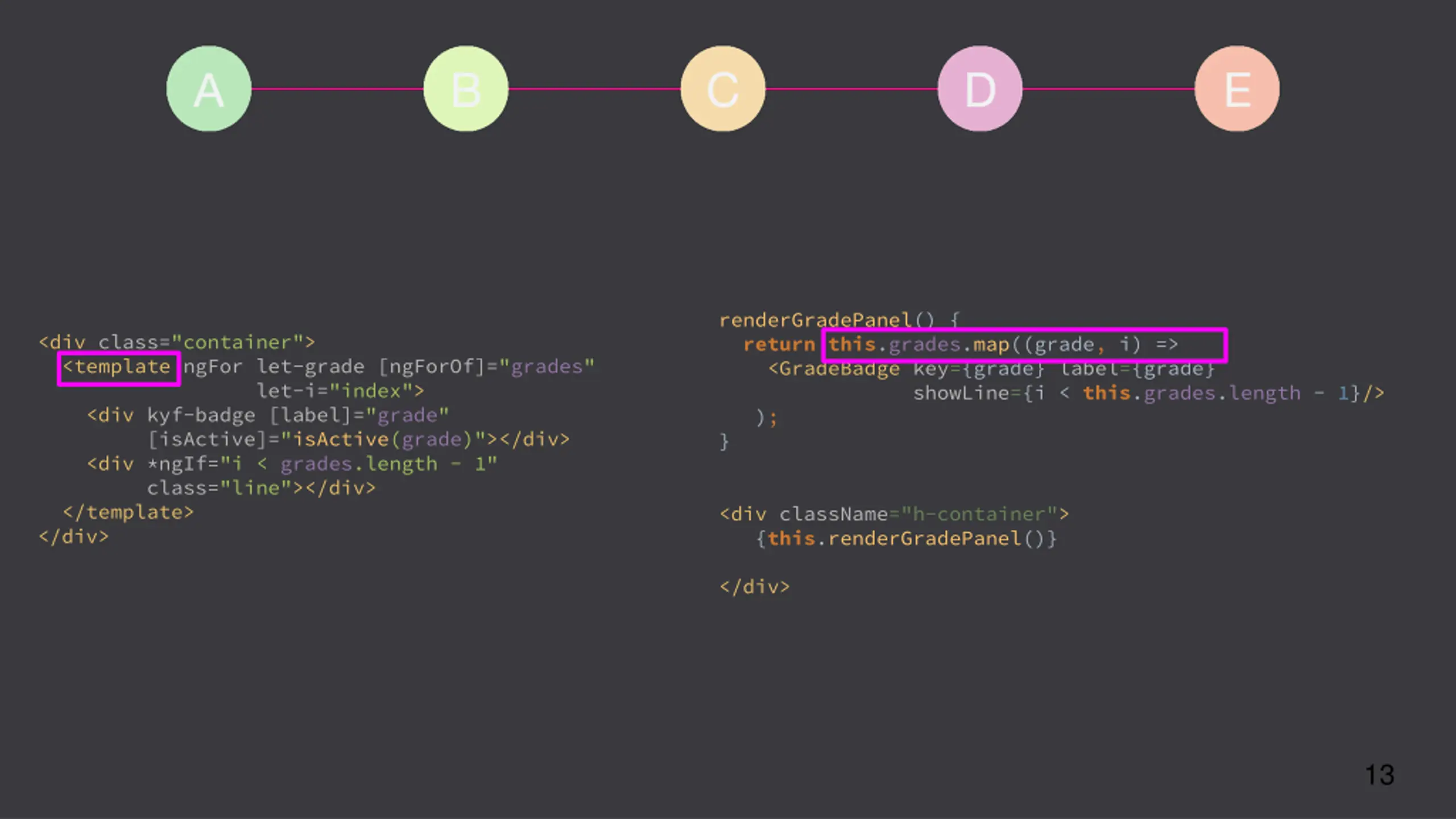 renderGradePanel() { return this.grades.map((grade, i) => <GradeBadge key={grade} label={grade} showLine={i < this.grades.length - 1}/> ); } <div class="container"> <template ngFor let-grade [ngForOf]="grades" let-i="index"> <div kyf-badge [label]="grade" [isActive]="isActive(grade)"></div> <div *ngIf="i < grades.length - 1" class="line"></div> </template> </div> <div className="h-container"> {this.renderGradePanel()} </div> 13