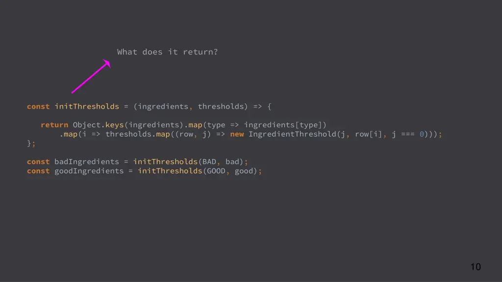 What does it return? const initThresholds = (ingredients, thresholds) => { return Object.keys(ingredients).map(type => ingredients[type]) .map(i => thresholds.map((row, j) => new IngredientThreshold(j, row[i], j === 0))); }; const badIngredients = initThresholds(BAD, bad); const goodIngredients = initThresholds(GOOD, good); 10