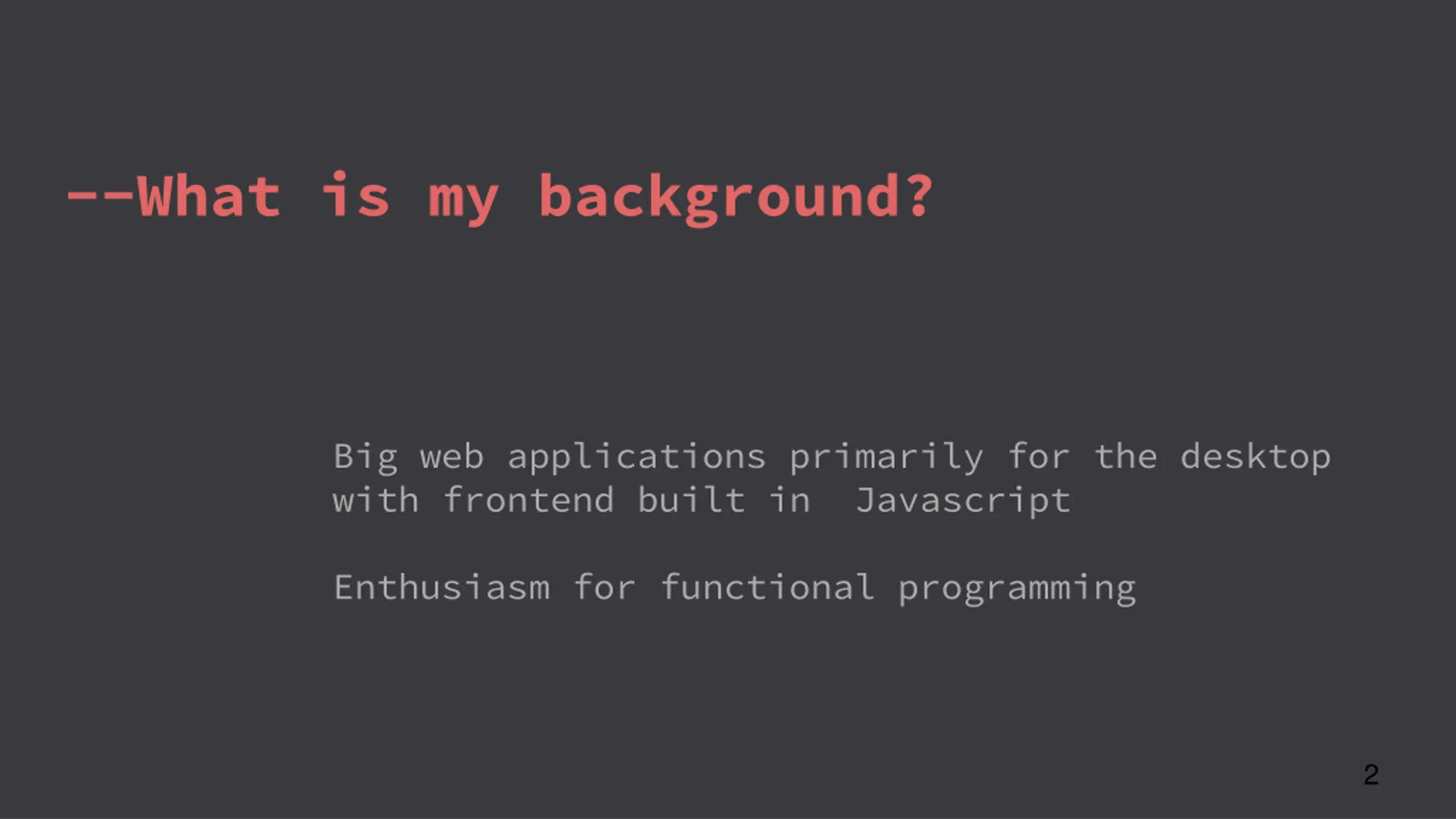 --What is my background? Big web applications primarily for the desktop with frontend built in Javascript Enthusiasm for functional programming 2