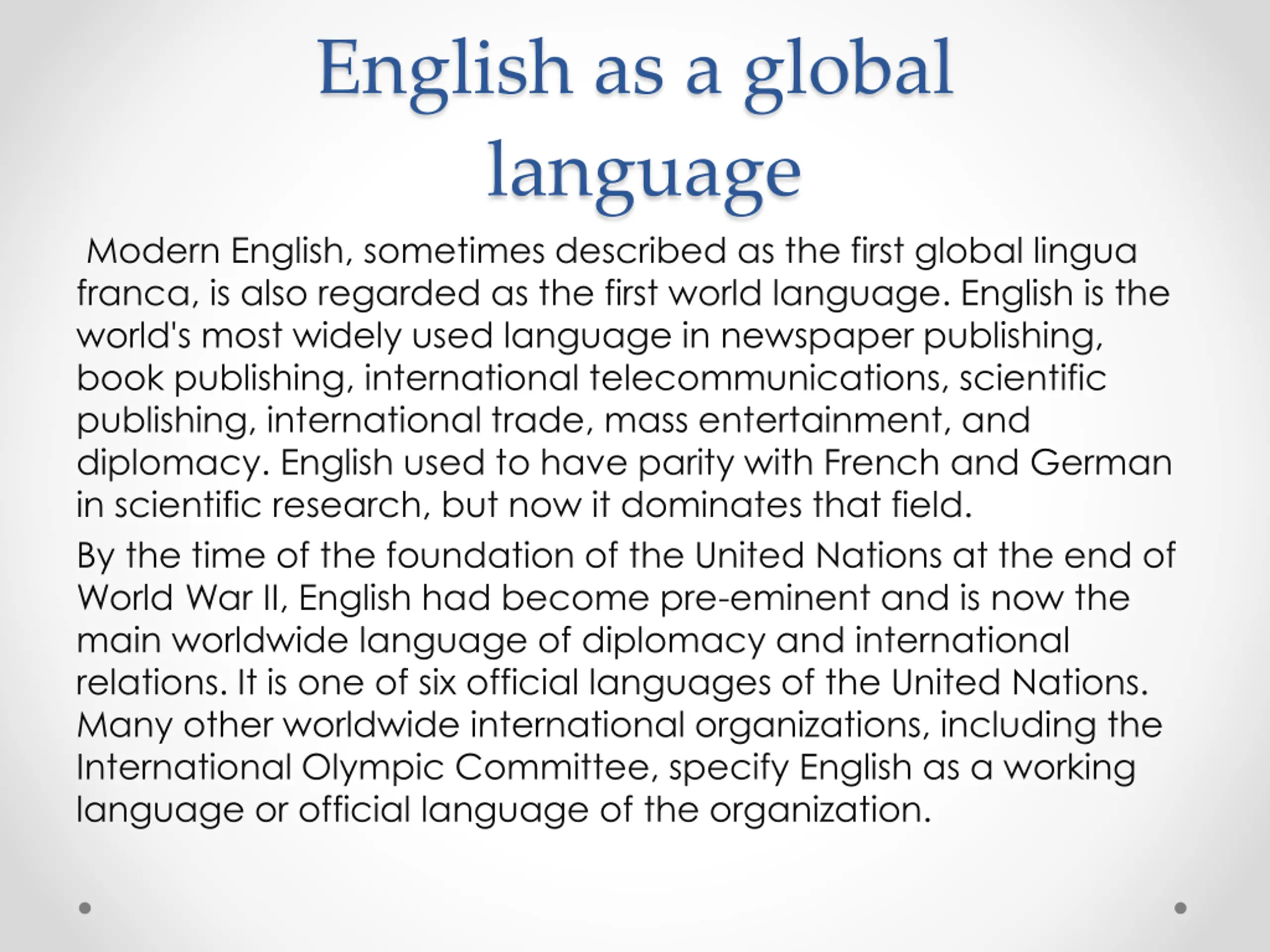 English as a global language Modern English, sometimes described as the first global lingua franca, is also regarded as the first world language. English is the world's most widely used language in newspaper publishing, book publishing, international telecommunications, scientific publishing, international trade, mass entertainment, and diplomacy. English used to have parity with French and German in scientific research, but now it dominates that field. By the time of the foundation of the United Nations at the end of World War II, English had become pre-eminent and is now the main worldwide language of diplomacy and international relations. It is one of six official languages of the United Nations. Many other worldwide international organizations, including the International Olympic Committee, specify English as a working language or official language of the organization.