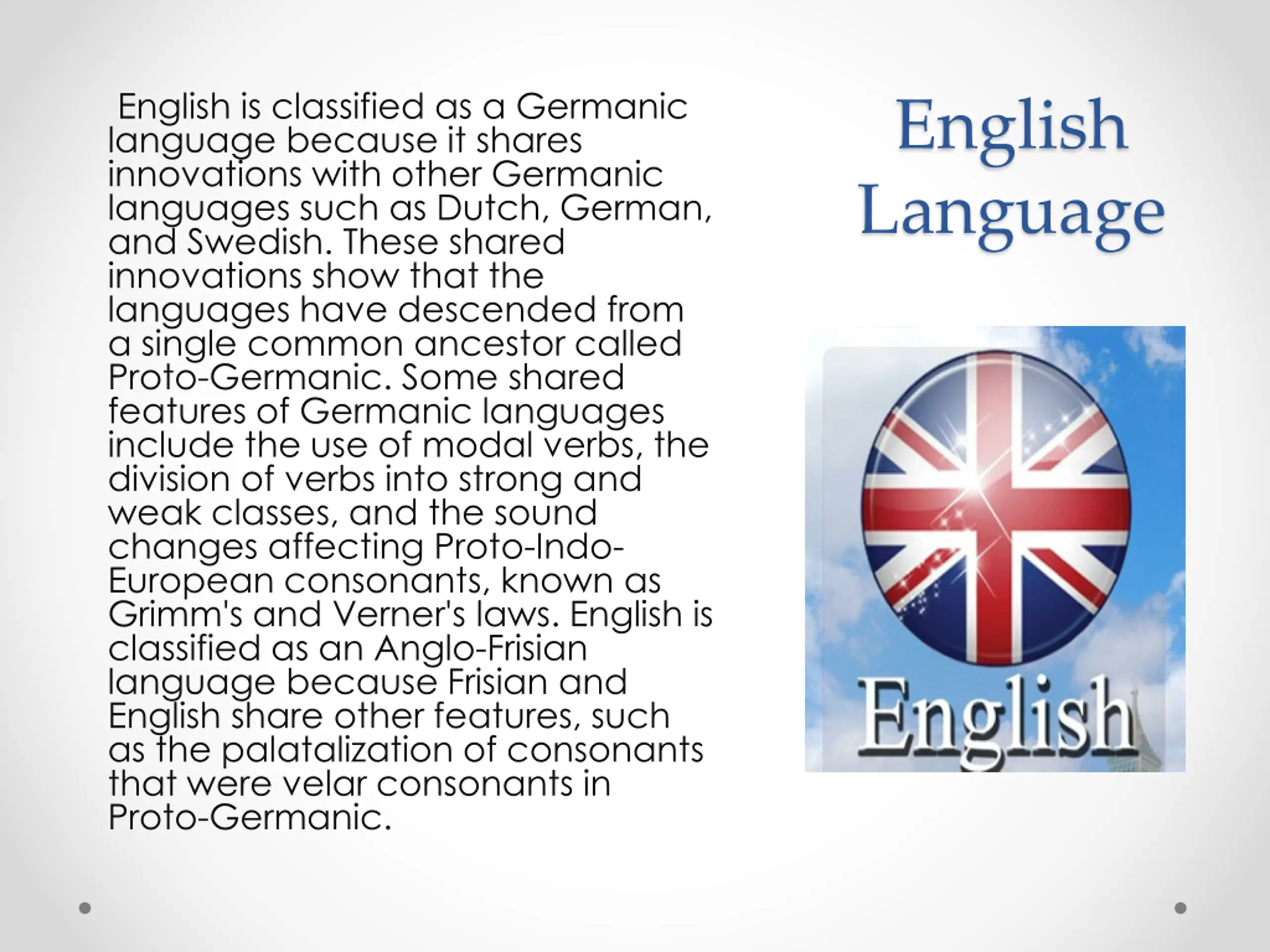 English is classified as a Germanic language because it shares innovations with other Germanic languages such as Dutch, German, and Swedish. These shared innovations show that the languages have descended from a single common ancestor called Proto-Germanic. Some shared features of Germanic languages include the use of modal verbs, the division of verbs into strong and weak classes, and the sound changes affecting Proto-Indo- European consonants, known as Grimm's and Verner's laws. English is classified as an Anglo-Frisian language because Frisian and English share other features, such as the palatalization of consonants that were velar consonants in Proto-Germanic. English Language