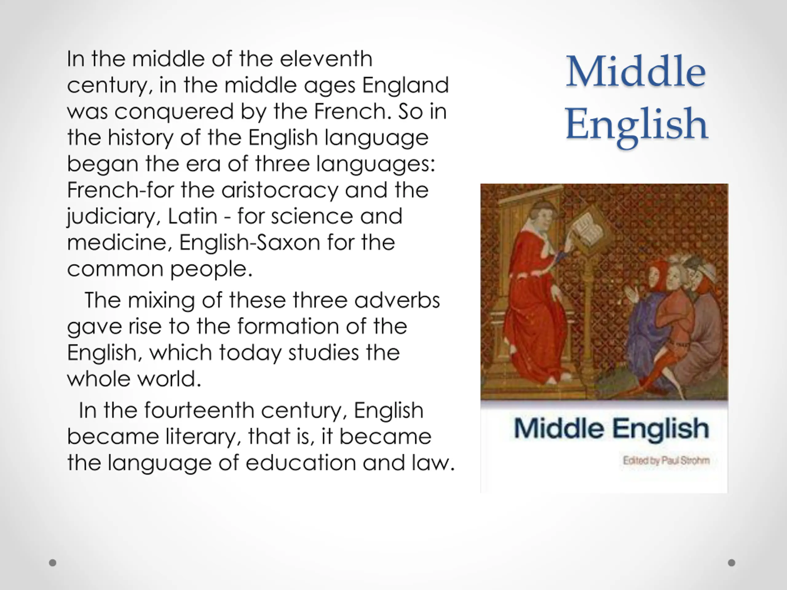 In the middle of the eleventh century, in the middle ages England was conquered by the French. So in the history of the English language began the era of three languages: French-for the aristocracy and the judiciary, Latin - for science and medicine, English-Saxon for the common people. The mixing of these three adverbs gave rise to the formation of the English, which today studies the whole world. In the fourteenth century, English became literary, that is, it became the language of education and law. Middle English