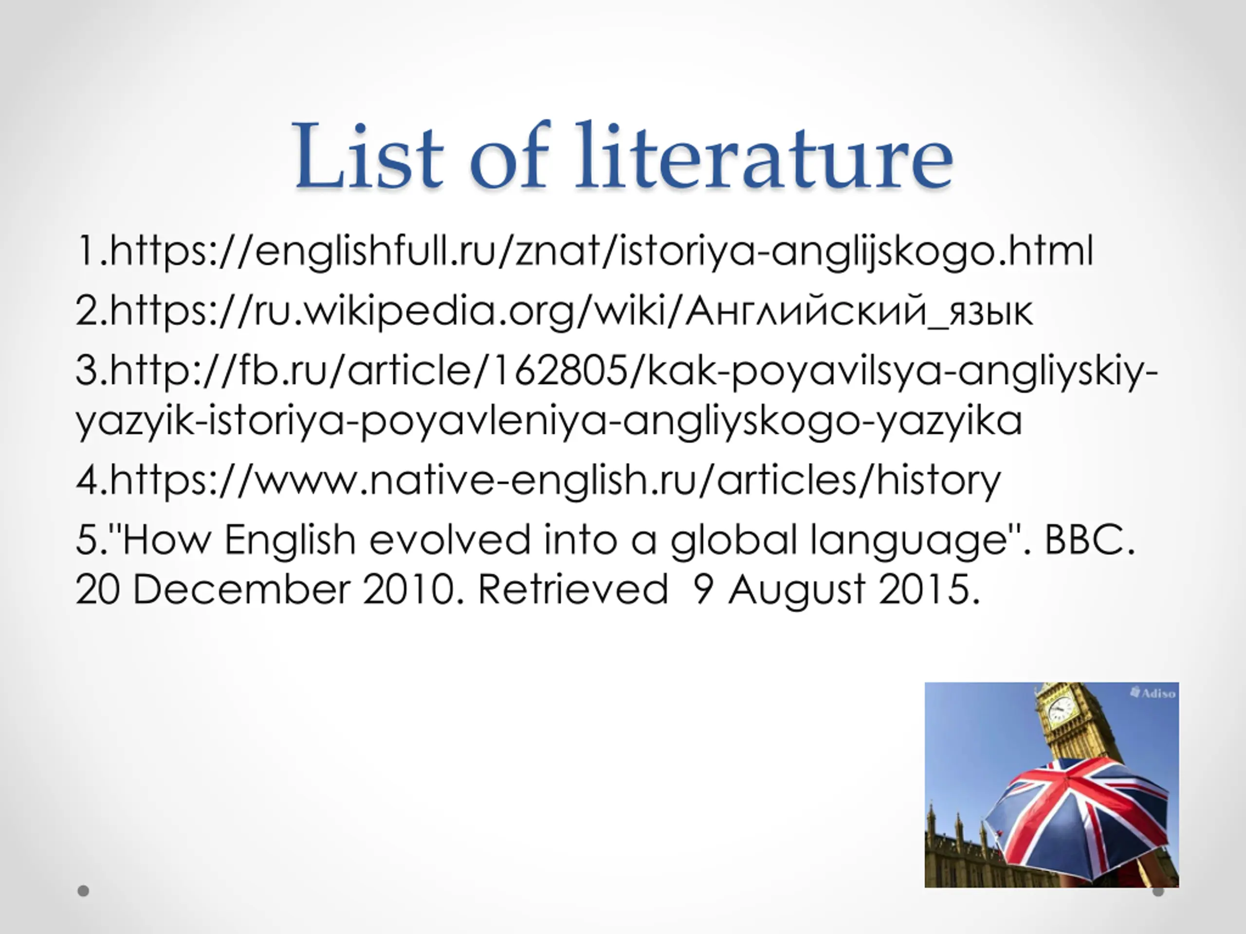 List of literature 1.https://englishfull.ru/znat/istoriya-anglijskogo.html 2.https://ru.wikipedia.org/wiki/ _ 3.http://fb.ru/article/162805/kak-poyavilsya-angliyskiy- yazyik-istoriya-poyavleniya-angliyskogo-yazyika 4.https://www.native-english.ru/articles/history 5."How English evolved into a global language". BBC. 20 December 2010. Retrieved 9 August 2015.