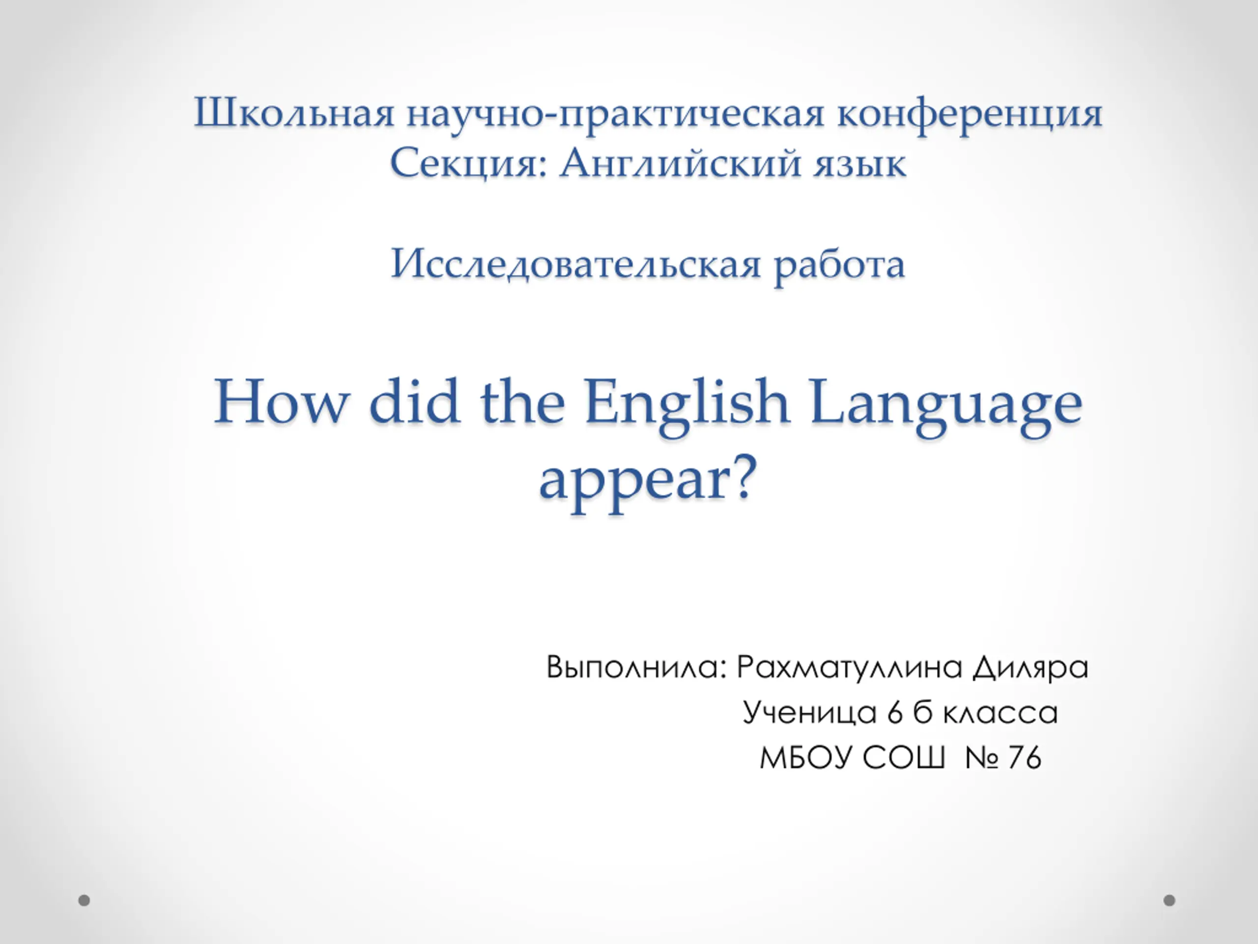 The aim of my work is to find out how the English Language appeared. The tasks of my work: To know who started to speak English for the first time When and where the language appeared How it became an i The actuality of my work: not only me, but also a lot of people wondered: how and where English language appeared. In our work we will find out how it happened. The problem of my work is, that many people who have learnt English for years don t know the history of the language. Hypothesis: During the process of language contact between English and other languages the vocabulary of English due to borrowings is very rich. nternational language