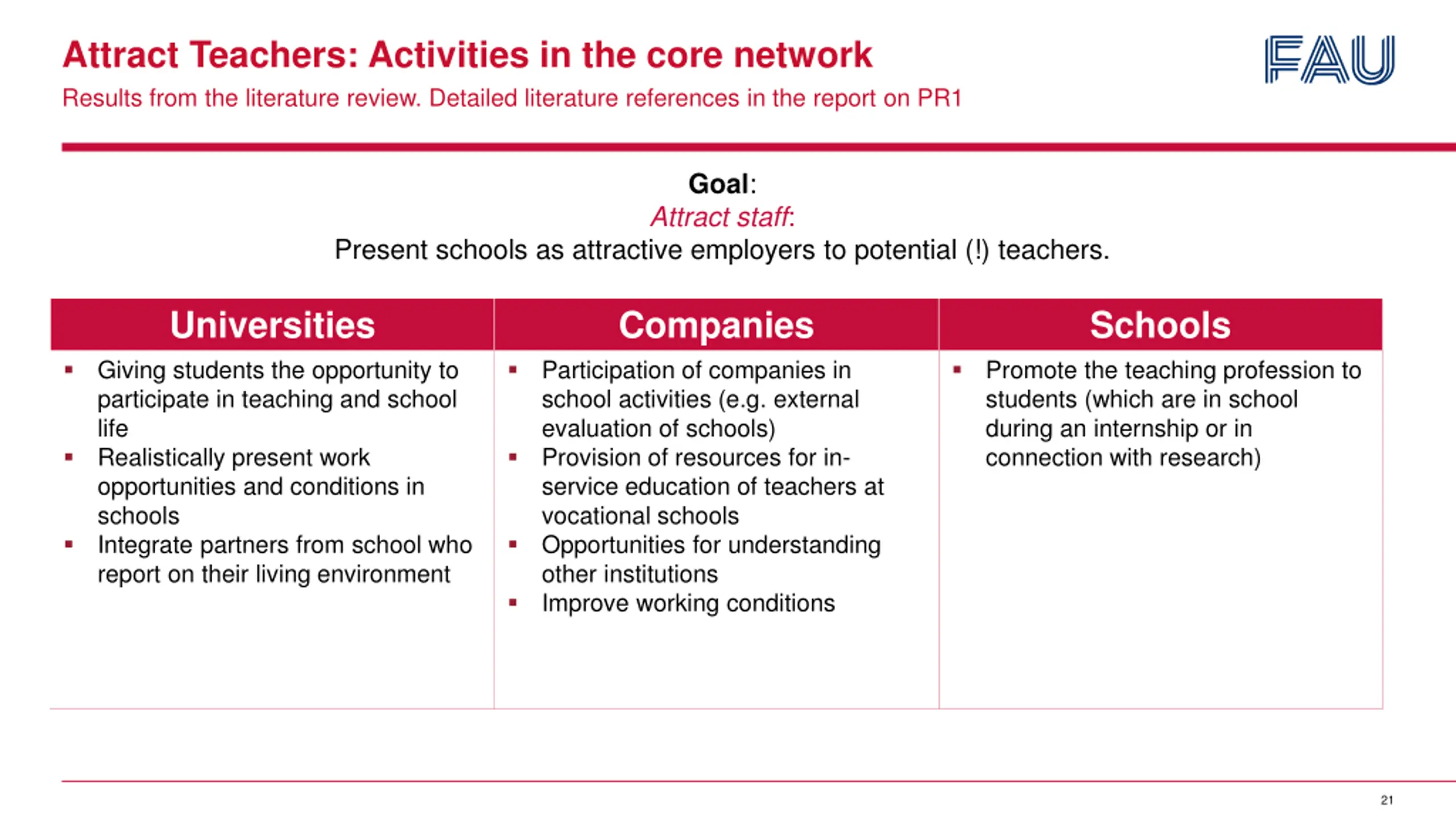 Attract Teachers: Activities in the core network Results from the literature review. Detailed literature references in the report on PR1 Goal: Attract staff: Present schools as attractive employers to potential (!) teachers. Universities Giving students the opportunity to participate in teaching and school life Realistically present work opportunities and conditions in schools Integrate partners from school who report on their living environment Companies Participation of companies in school activities (e.g. external evaluation of schools) Provision of resources for in- service education of teachers at vocational schools Opportunities for understanding other institutions Improve working conditions Schools Promote the teaching profession to students (which are in school during an internship or in connection with research) 21