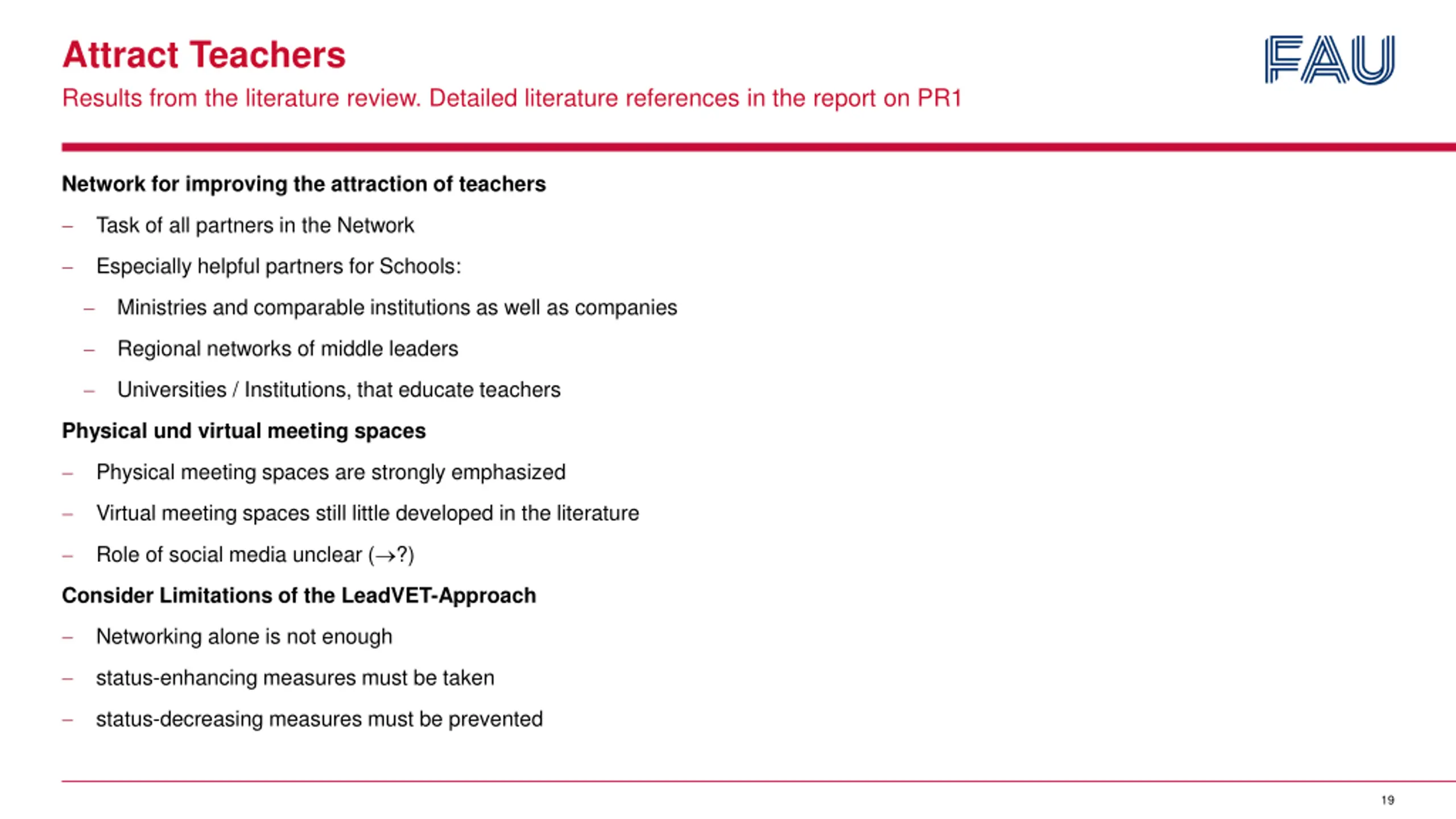 Attract Teachers Results from the literature review. Detailed literature references in the report on PR1 Network for improving the attraction of teachers Task of all partners in the Network Especially helpful partners for Schools: Ministries and comparable institutions as well as companies Regional networks of middle leaders Universities / Institutions, that educate teachers Physical und virtual meeting spaces Physical meeting spaces are strongly emphasized Virtual meeting spaces still little developed in the literature Role of social media unclear ( ?) Consider Limitations of the LeadVET-Approach Networking alone is not enough status-enhancing measures must be taken status-decreasing measures must be prevented 19