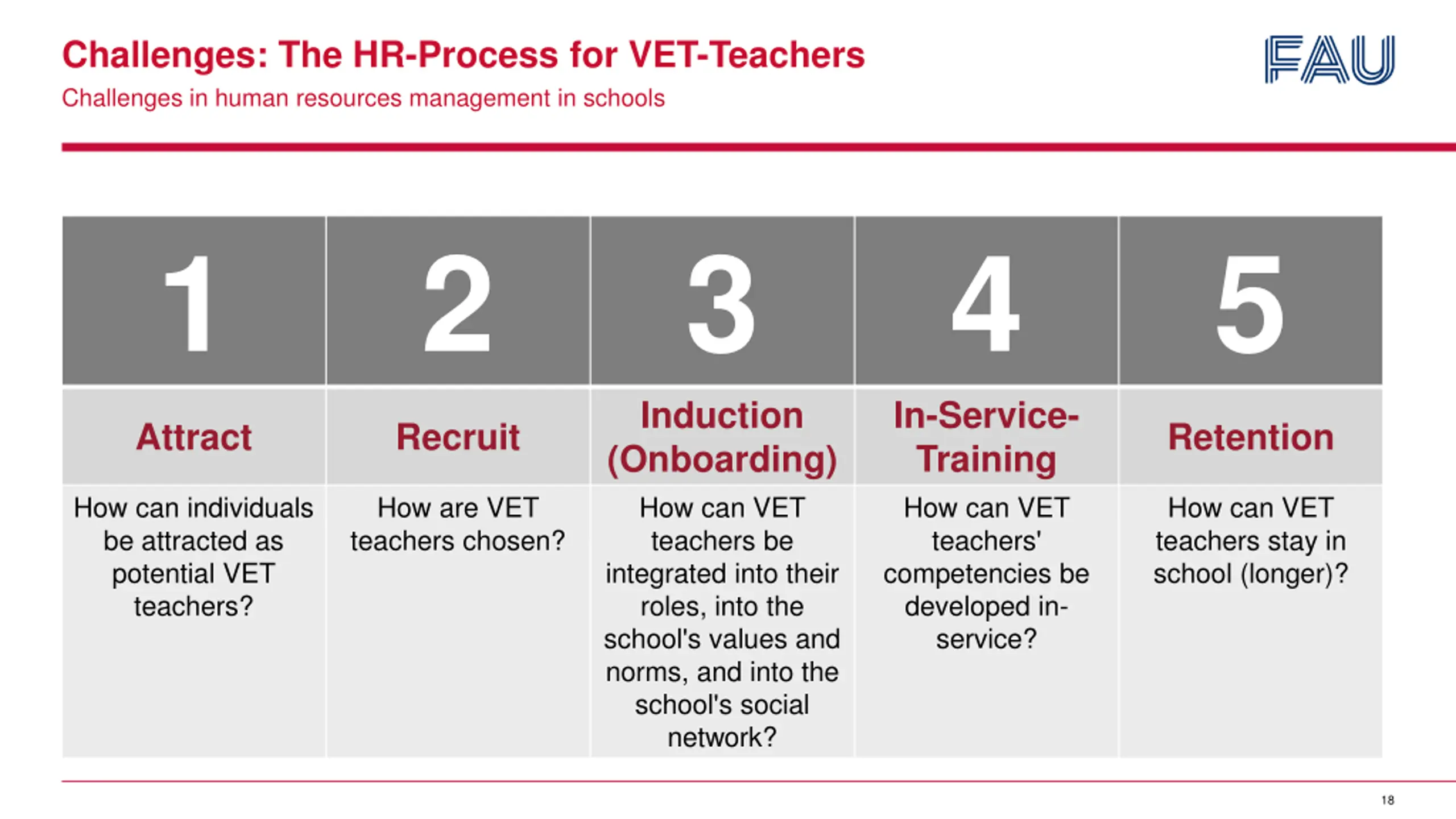Challenges: The HR-Process for VET-Teachers Challenges in human resources management in schools 1 2 3 4 5 Induction (Onboarding) How can VET teachers be integrated into their roles, into the school's values and norms, and into the school's social network? In-Service- Training How can VET teachers' competencies be developed in- service? Attract Recruit Retention How can individuals be attracted as potential VET teachers? How are VET teachers chosen? How can VET teachers stay in school (longer)? 18