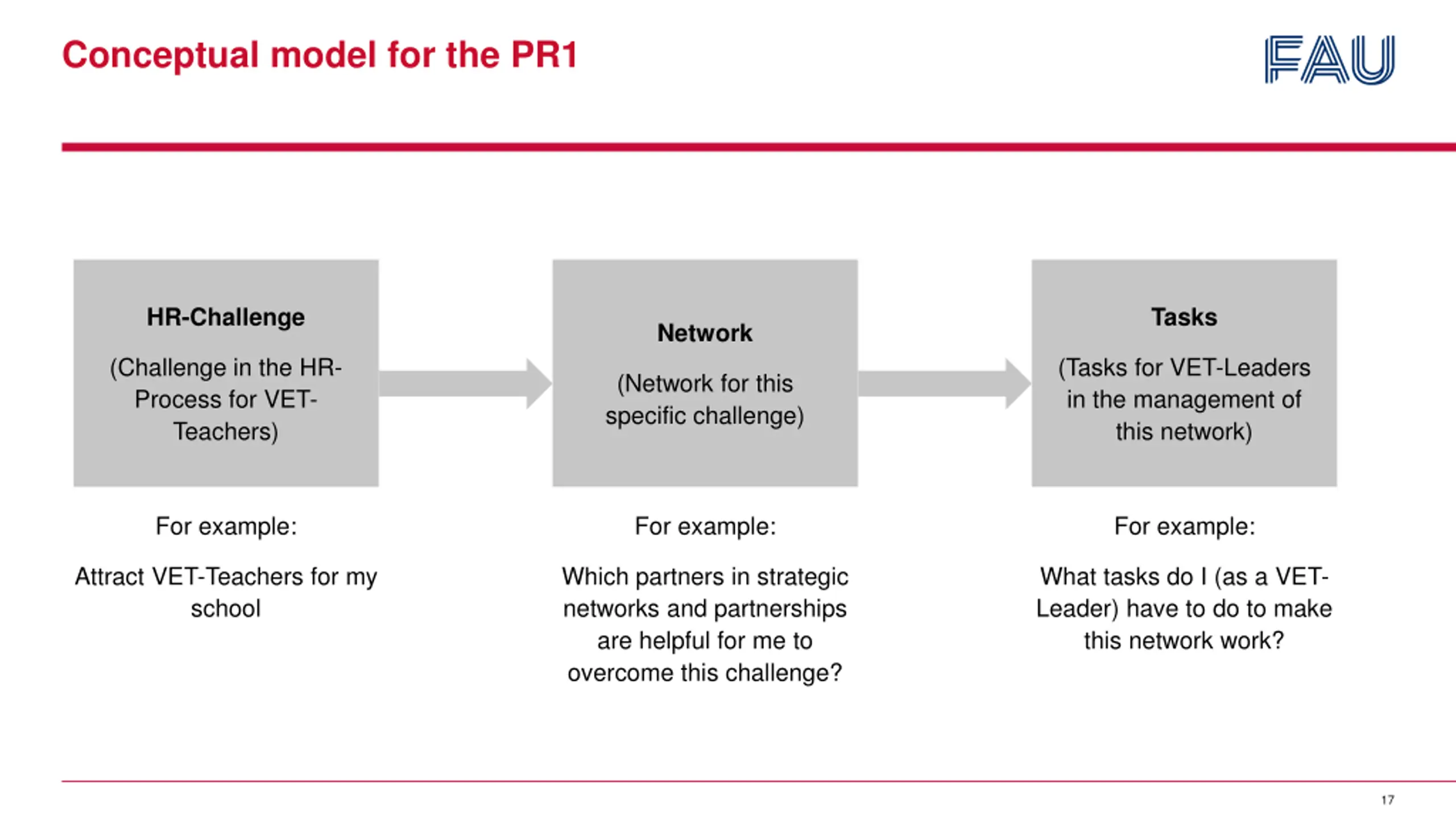 Conceptual model for the PR1 HR-Challenge Tasks Network (Challenge in the HR- Process for VET- Teachers) (Tasks for VET-Leaders in the management of this network) (Network for this specific challenge) For example: For example: For example: Attract VET-Teachers for my school Which partners in strategic networks and partnerships are helpful for me to overcome this challenge? What tasks do I (as a VET- Leader) have to do to make this network work? 17