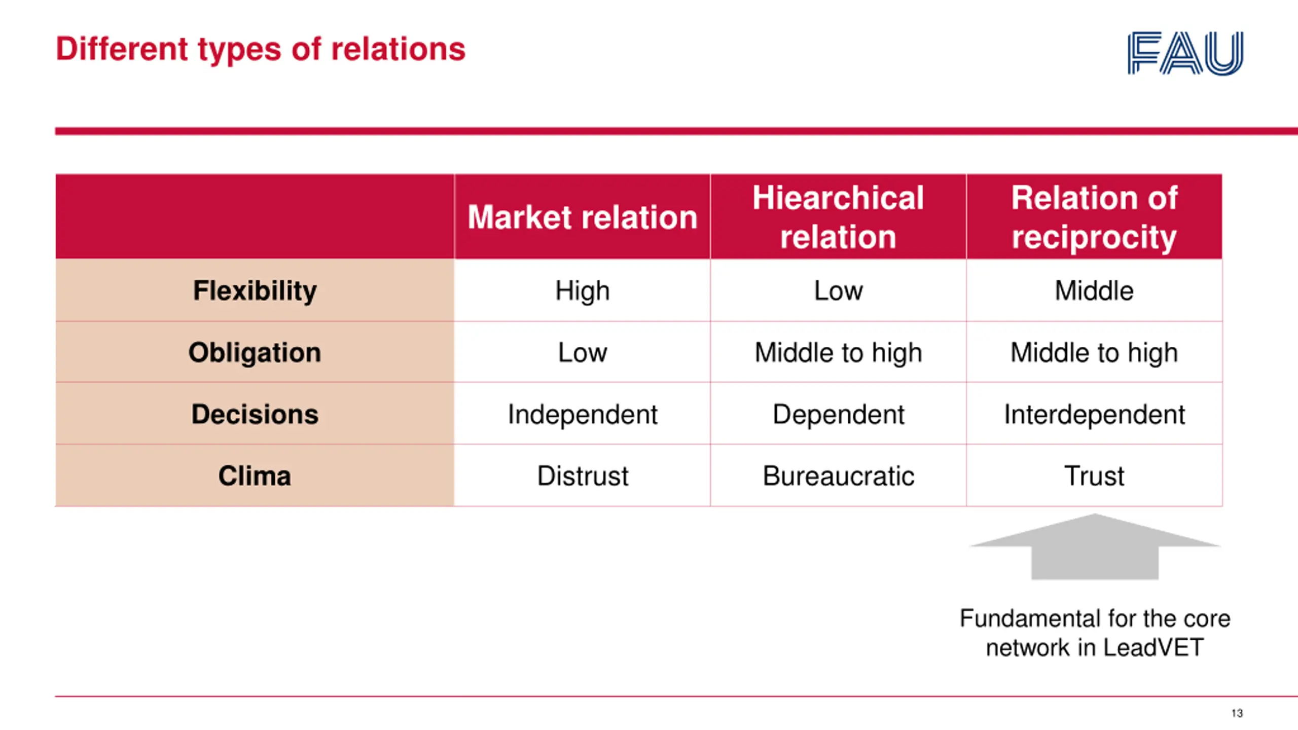 Different types of relations Hiearchical relation Relation of reciprocity Market relation High Low Middle Flexibility Low Middle to high Middle to high Obligation Independent Dependent Interdependent Decisions Distrust Bureaucratic Trust Clima Fundamental for the core network in LeadVET 13