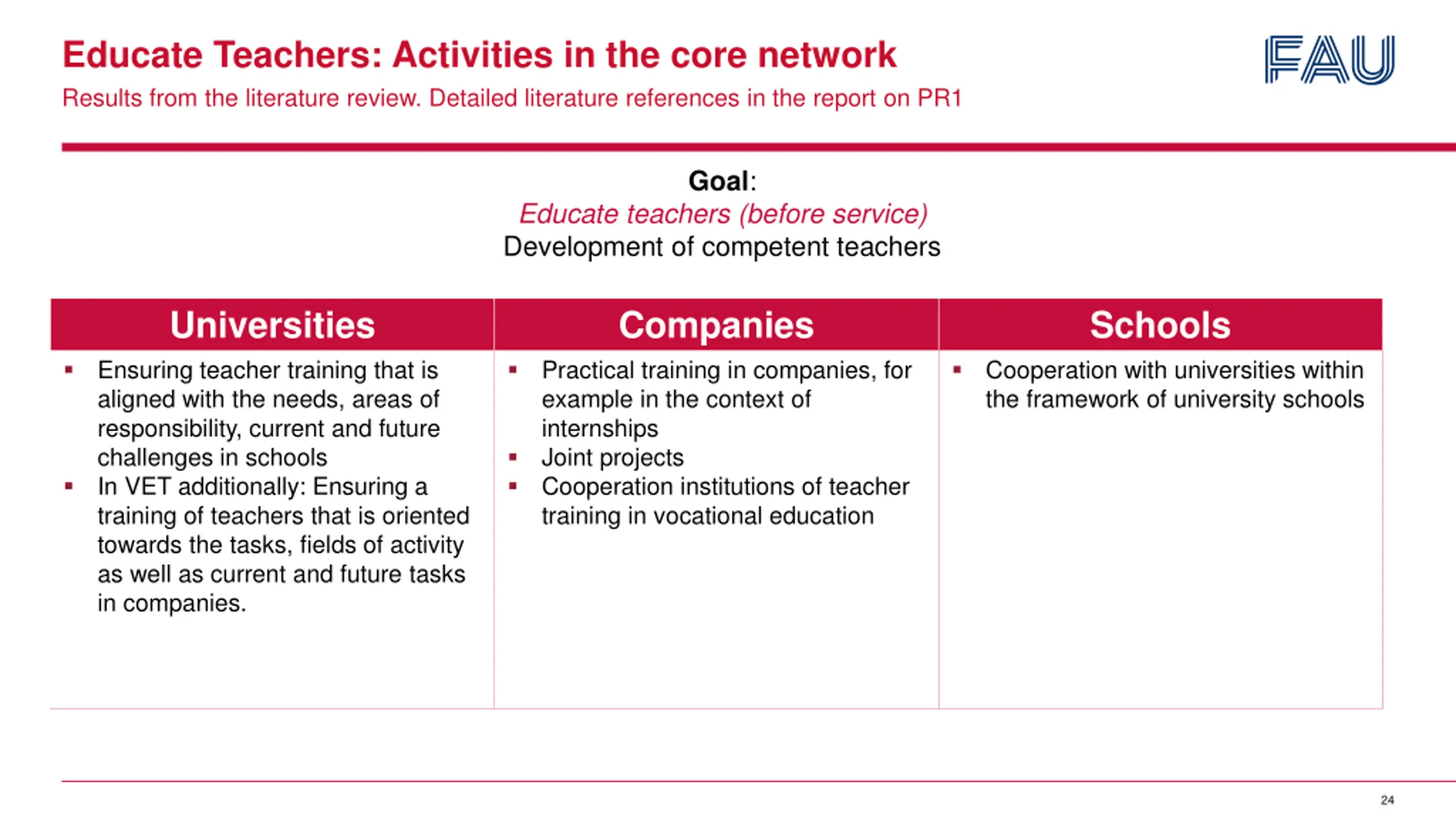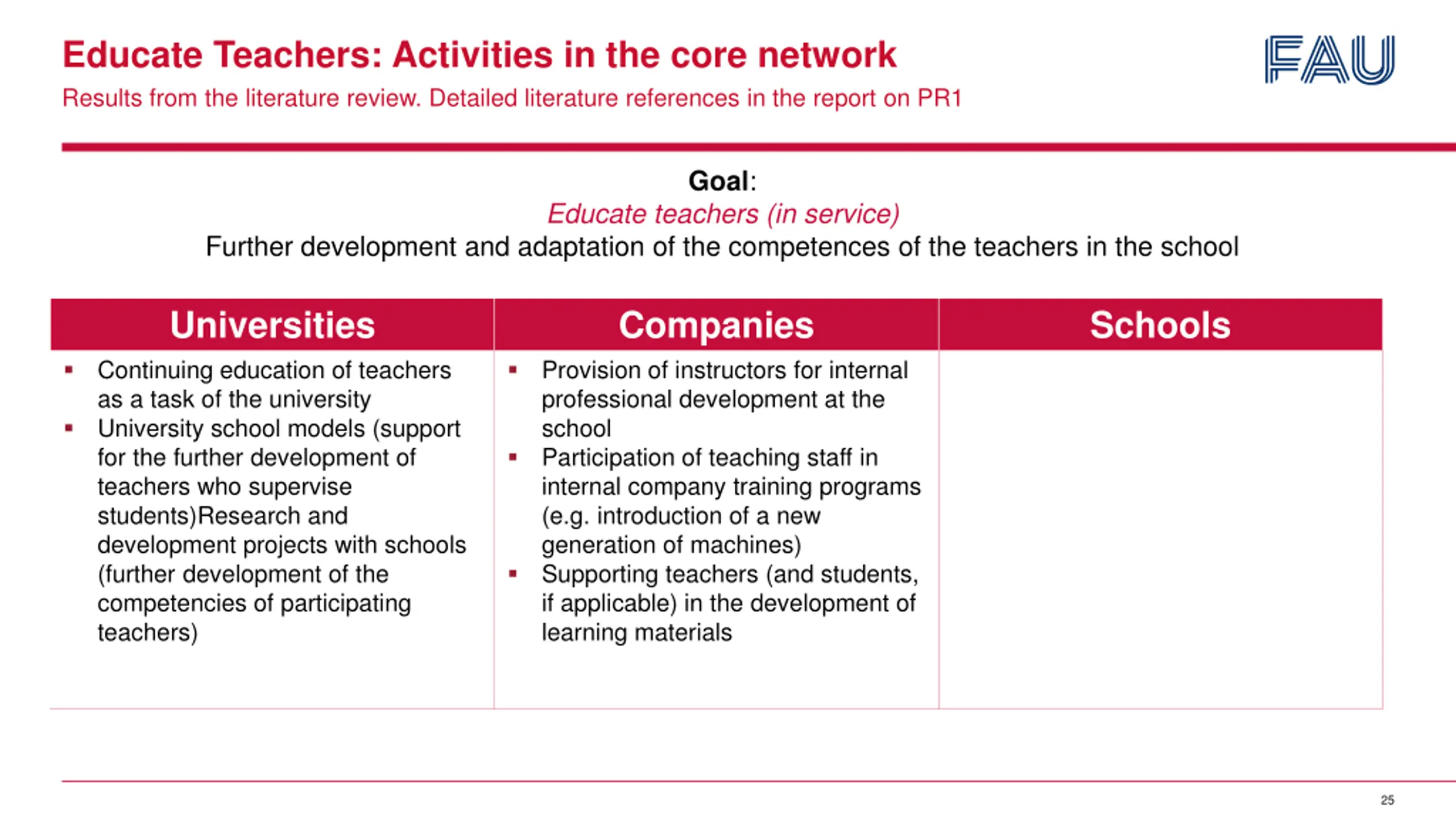 Educate Teachers: Activities in the core network Results from the literature review. Detailed literature references in the report on PR1 Goal: Educate teachers (before service) Development of competent teachers Universities Ensuring teacher training that is aligned with the needs, areas of responsibility, current and future challenges in schools In VET additionally: Ensuring a training of teachers that is oriented towards the tasks, fields of activity as well as current and future tasks in companies. Companies Practical training in companies, for example in the context of internships Joint projects Cooperation institutions of teacher training in vocational education Schools Cooperation with universities within the framework of university schools 24