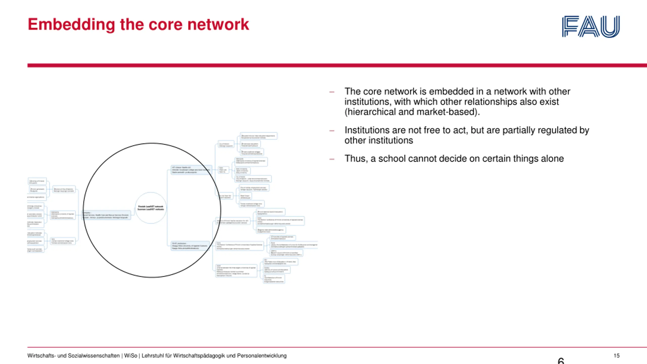 Embedding the core network The core network is embedded in a network with other institutions, with which other relationships also exist (hierarchical and market-based). Institutions are not free to act, but are partially regulated by other institutions Thus, a school cannot decide on certain things alone Wirtschafts- und Sozialwissenschaften | WiSo | Lehrstuhl f r Wirtschaftsp dagogik und Personalentwicklung 15 6.