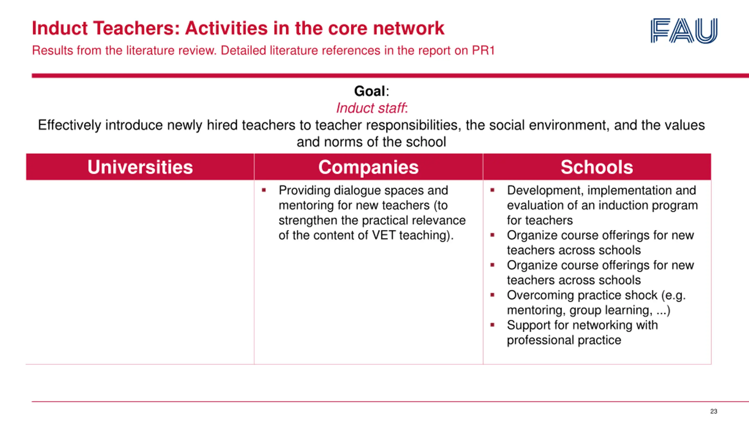 Induct Teachers: Activities in the core network Results from the literature review. Detailed literature references in the report on PR1 Goal: Induct staff: Effectively introduce newly hired teachers to teacher responsibilities, the social environment, and the values and norms of the school Universities Companies Providing dialogue spaces and mentoring for new teachers (to strengthen the practical relevance of the content of VET teaching). Schools Development, implementation and evaluation of an induction program for teachers Organize course offerings for new teachers across schools Organize course offerings for new teachers across schools Overcoming practice shock (e.g. mentoring, group learning, ...) Support for networking with professional practice 23