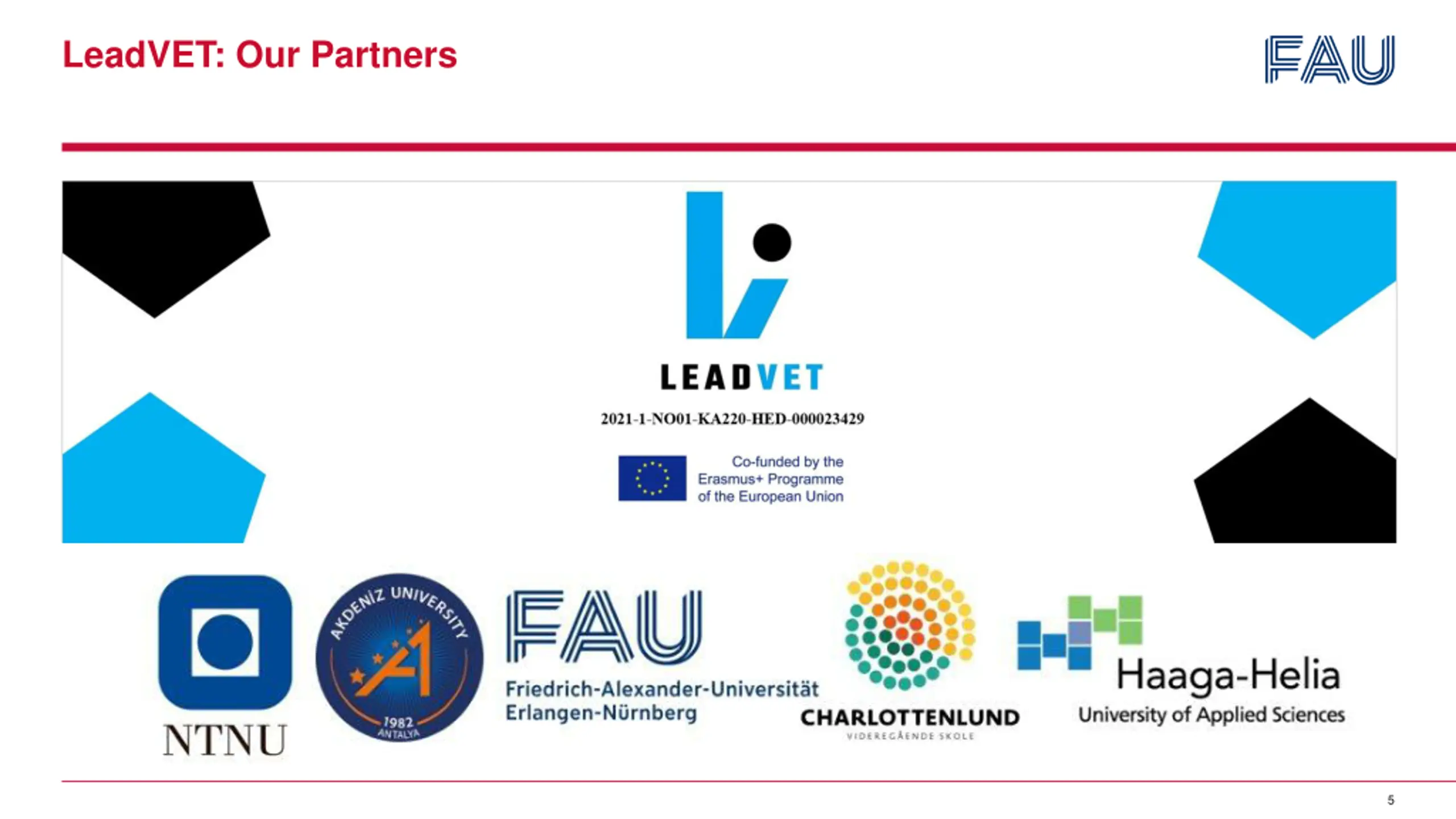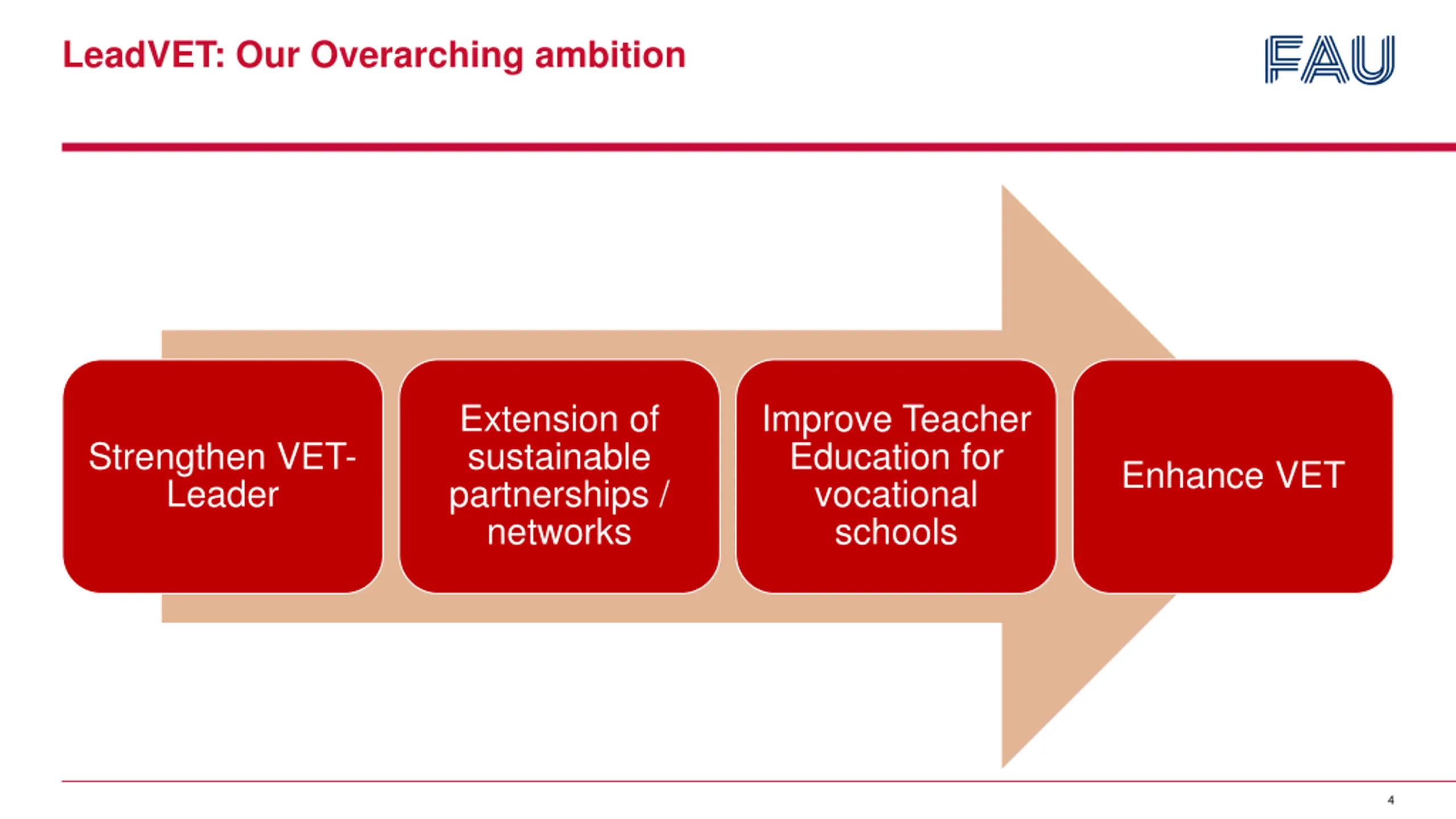 LeadVET: Our Overarching ambition Extension of sustainable partnerships / networks Improve Teacher Education for vocational schools Strengthen VET- Leader Enhance VET 4