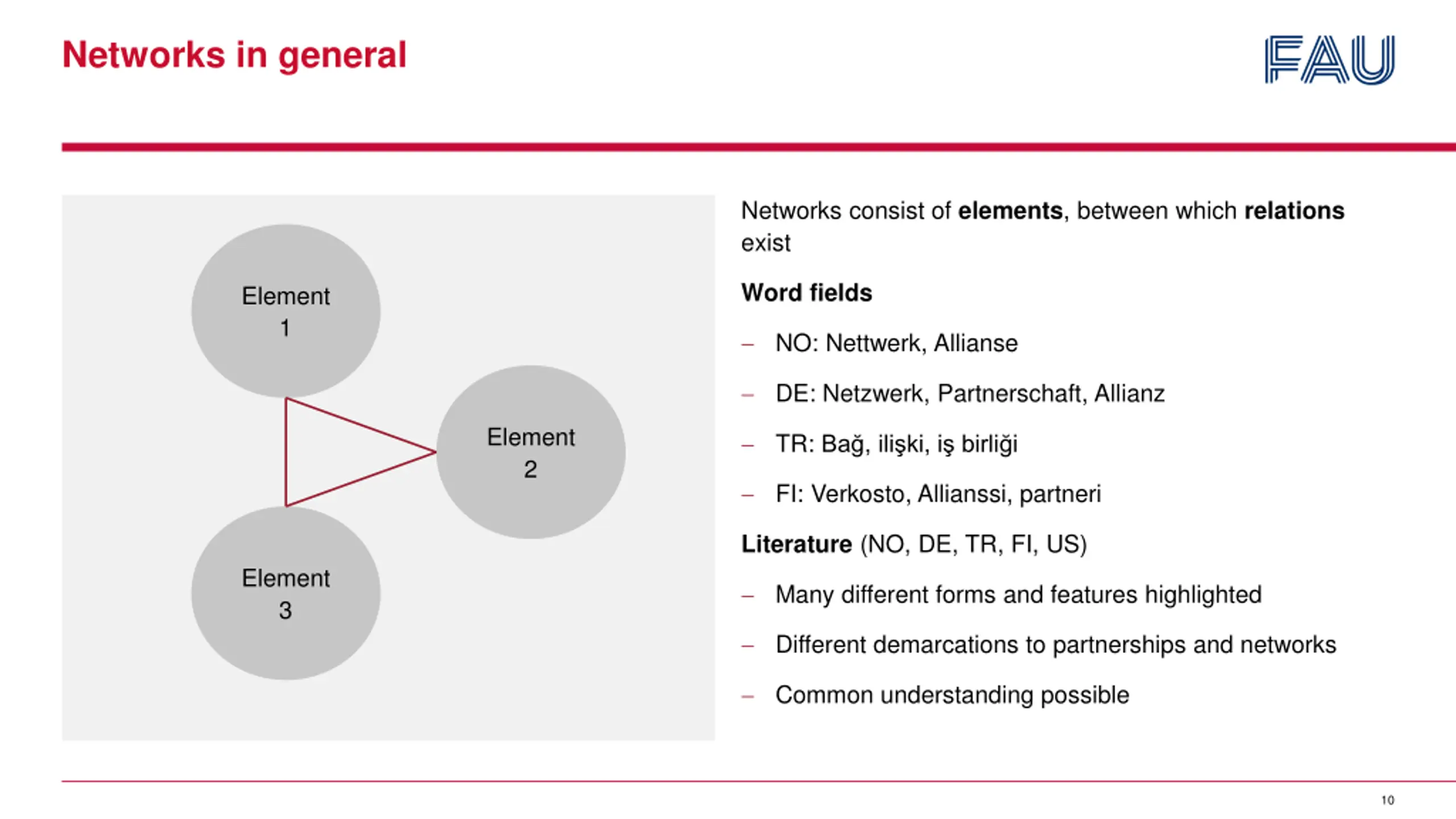 Networks in general Networks consist of elements, between which relations exist Word fields Element 1 NO: Nettwerk, Allianse DE: Netzwerk, Partnerschaft, Allianz Element 2 TR: Ba , ili ki, i birli i FI: Verkosto, Allianssi, partneri Literature (NO, DE, TR, FI, US) Element 3 Many different forms and features highlighted Different demarcations to partnerships and networks Common understanding possible 10