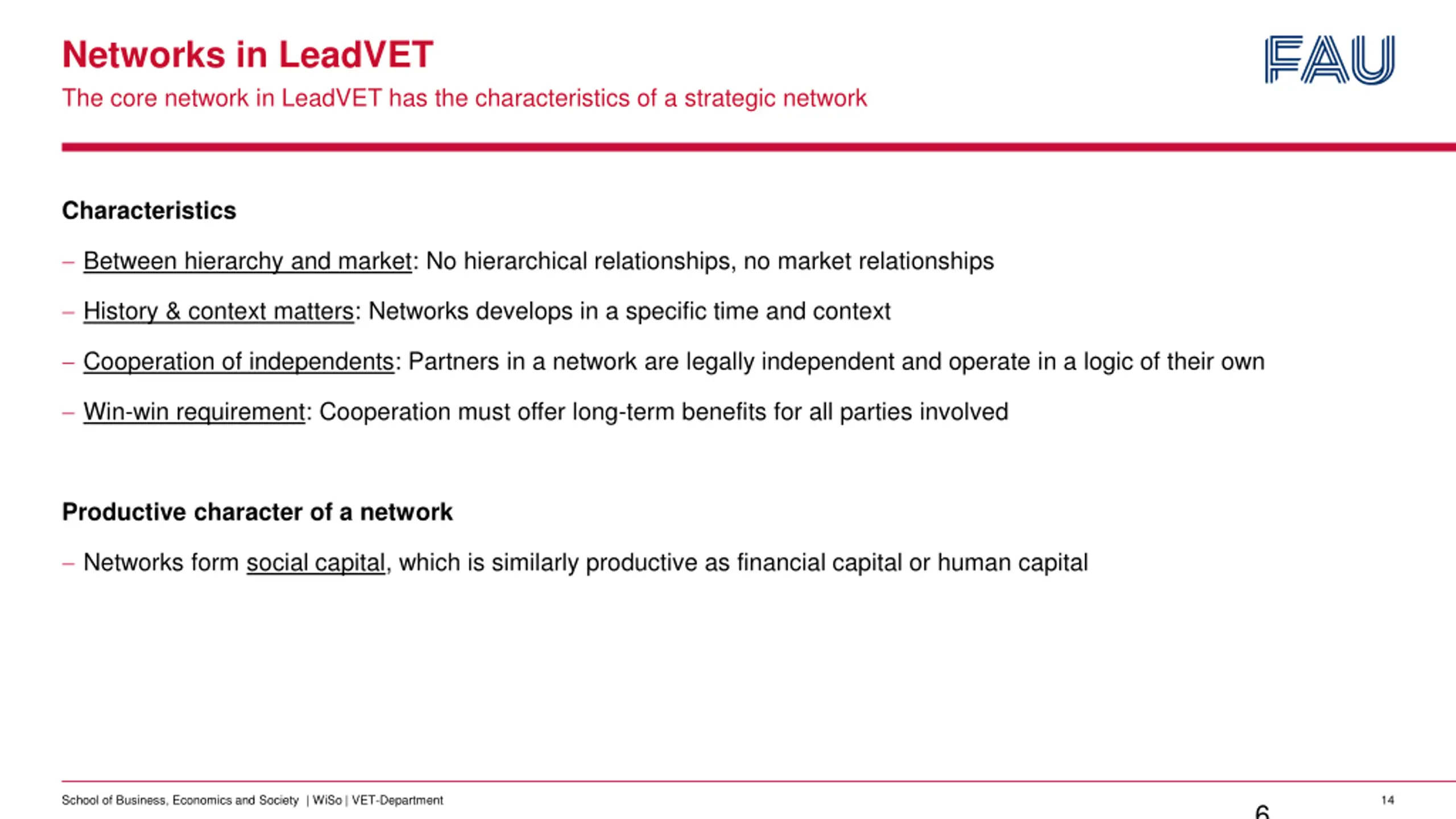 Networks in LeadVET The core network in LeadVET has the characteristics of a strategic network Characteristics Between hierarchy and market: No hierarchical relationships, no market relationships History & context matters: Networks develops in a specific time and context Cooperation of independents: Partners in a network are legally independent and operate in a logic of their own Win-win requirement: Cooperation must offer long-term benefits for all parties involved Productive character of a network Networks form social capital, which is similarly productive as financial capital or human capital School of Business, Economics and Society | WiSo | VET-Department 14 6.