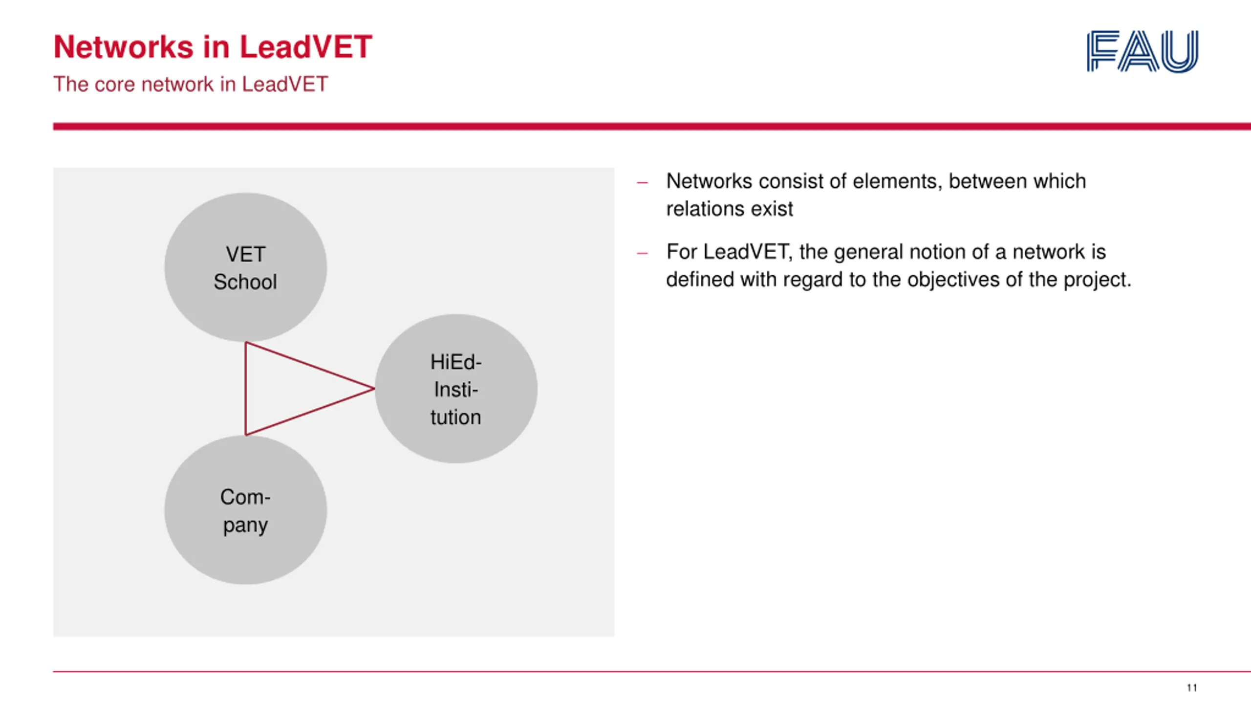 Networks in LeadVET The core network in LeadVET Networks consist of elements, between which relations exist For LeadVET, the general notion of a network is defined with regard to the objectives of the project. VET School HiEd- Insti- tution Com- pany 11