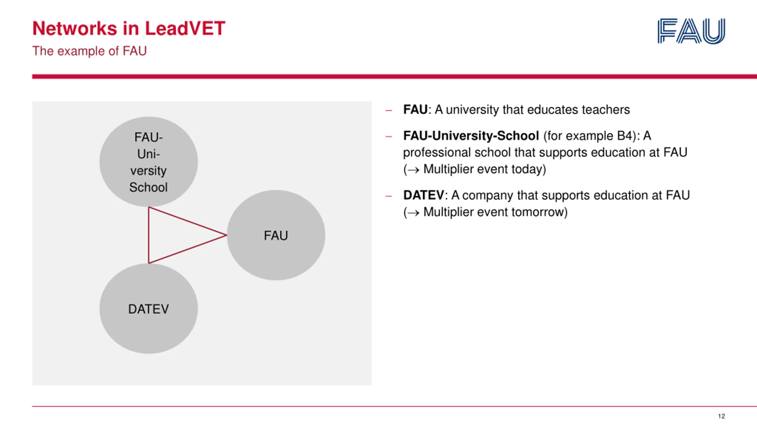 Networks in LeadVET The example of FAU FAU: A university that educates teachers FAU-University-School (for example B4): A professional school that supports education at FAU ( Multiplier event today) FAU- Uni- versity School DATEV: A company that supports education at FAU ( Multiplier event tomorrow) FAU DATEV 12