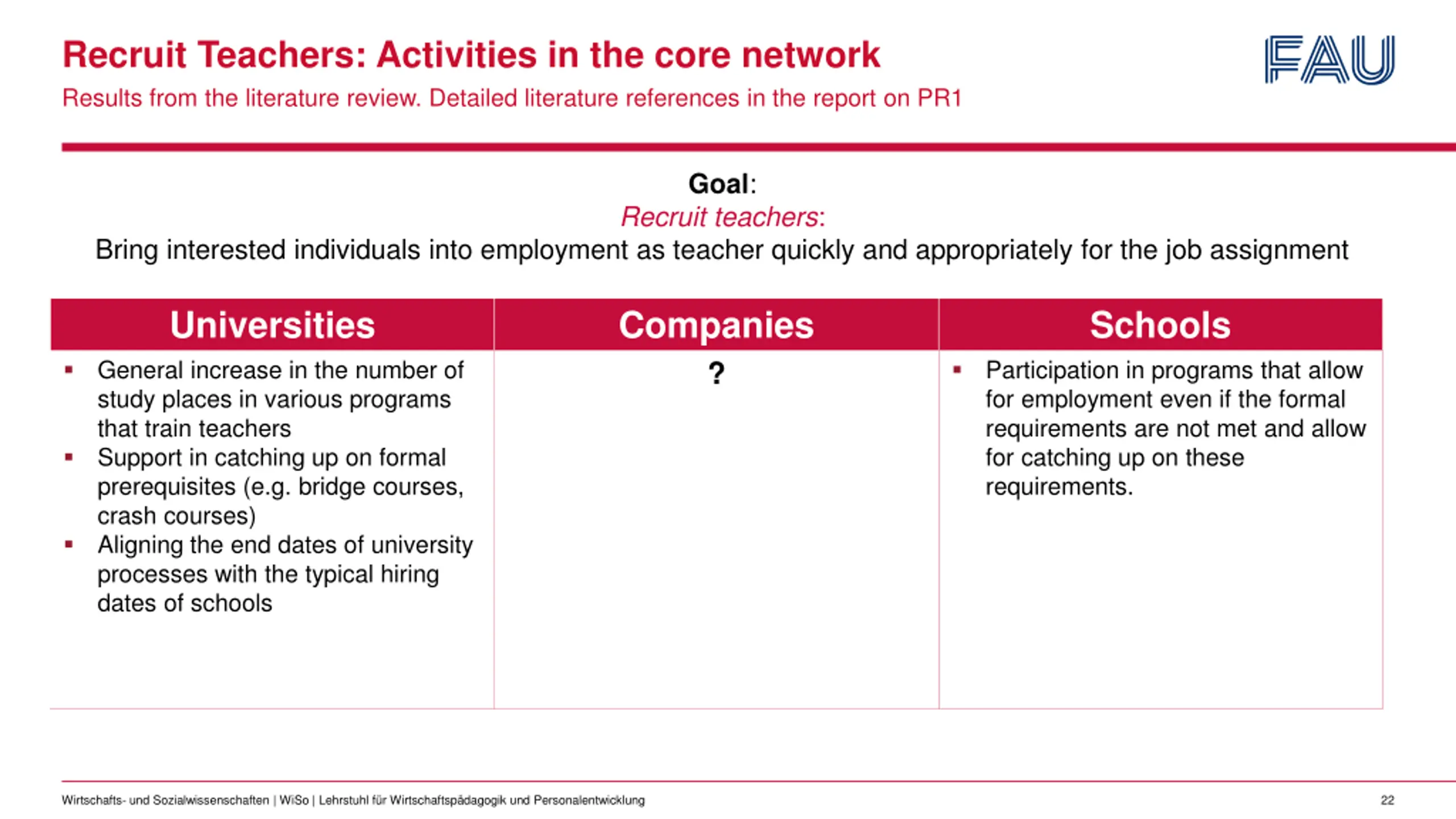 Recruit Teachers: Activities in the core network Results from the literature review. Detailed literature references in the report on PR1 Goal: Recruit teachers: Bring interested individuals into employment as teacher quickly and appropriately for the job assignment Universities General increase in the number of study places in various programs that train teachers Support in catching up on formal prerequisites (e.g. bridge courses, crash courses) Aligning the end dates of university processes with the typical hiring dates of schools Companies ? Schools Participation in programs that allow for employment even if the formal requirements are not met and allow for catching up on these requirements. Wirtschafts- und Sozialwissenschaften | WiSo | Lehrstuhl f r Wirtschaftsp dagogik und Personalentwicklung 22