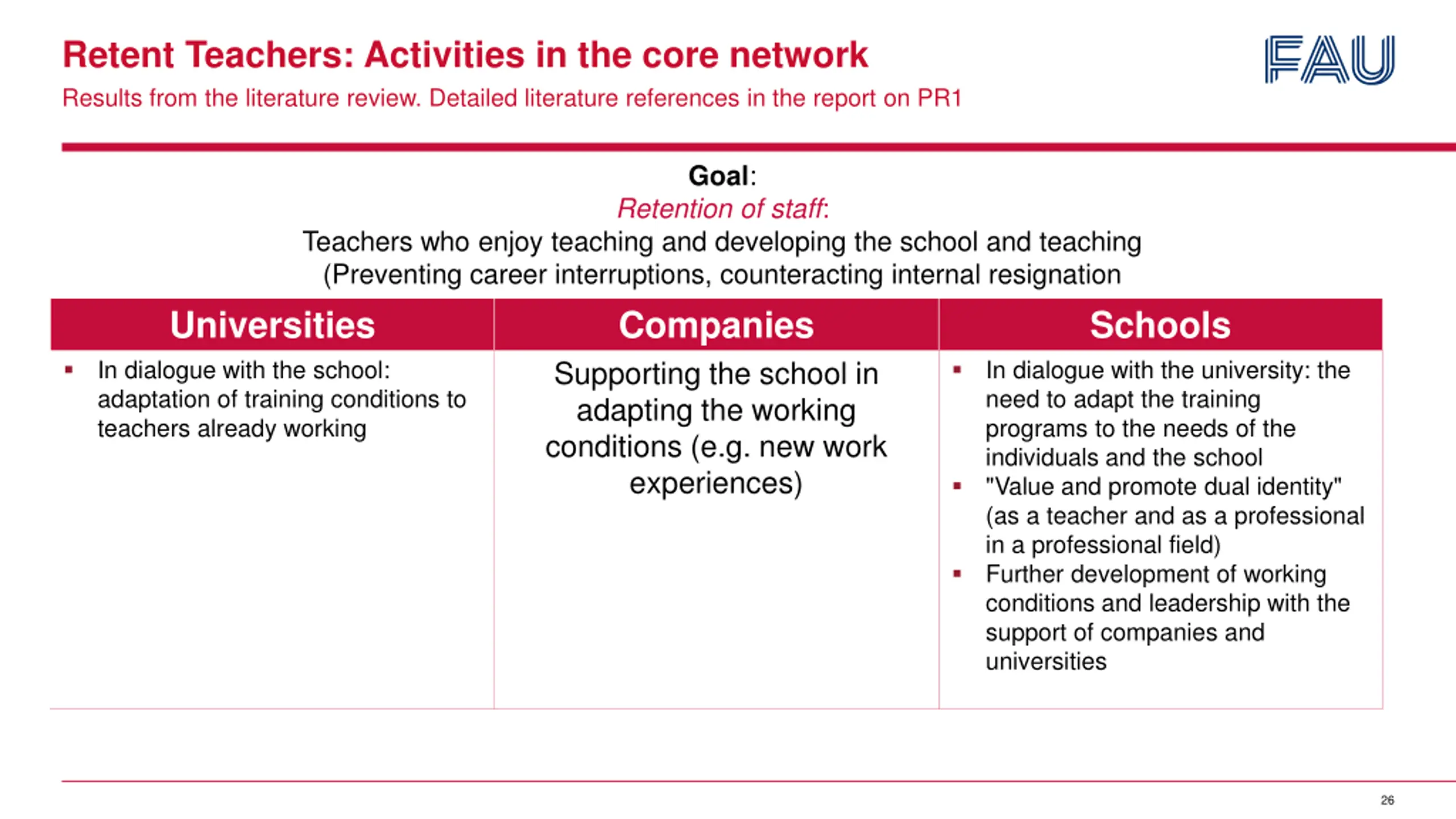 Retent Teachers: Activities in the core network Results from the literature review. Detailed literature references in the report on PR1 Goal: Retention of staff: Teachers who enjoy teaching and developing the school and teaching (Preventing career interruptions, counteracting internal resignation Universities In dialogue with the school: adaptation of training conditions to teachers already working Companies Supporting the school in adapting the working conditions (e.g. new work experiences) Schools In dialogue with the university: the need to adapt the training programs to the needs of the individuals and the school "Value and promote dual identity" (as a teacher and as a professional in a professional field) Further development of working conditions and leadership with the support of companies and universities 26