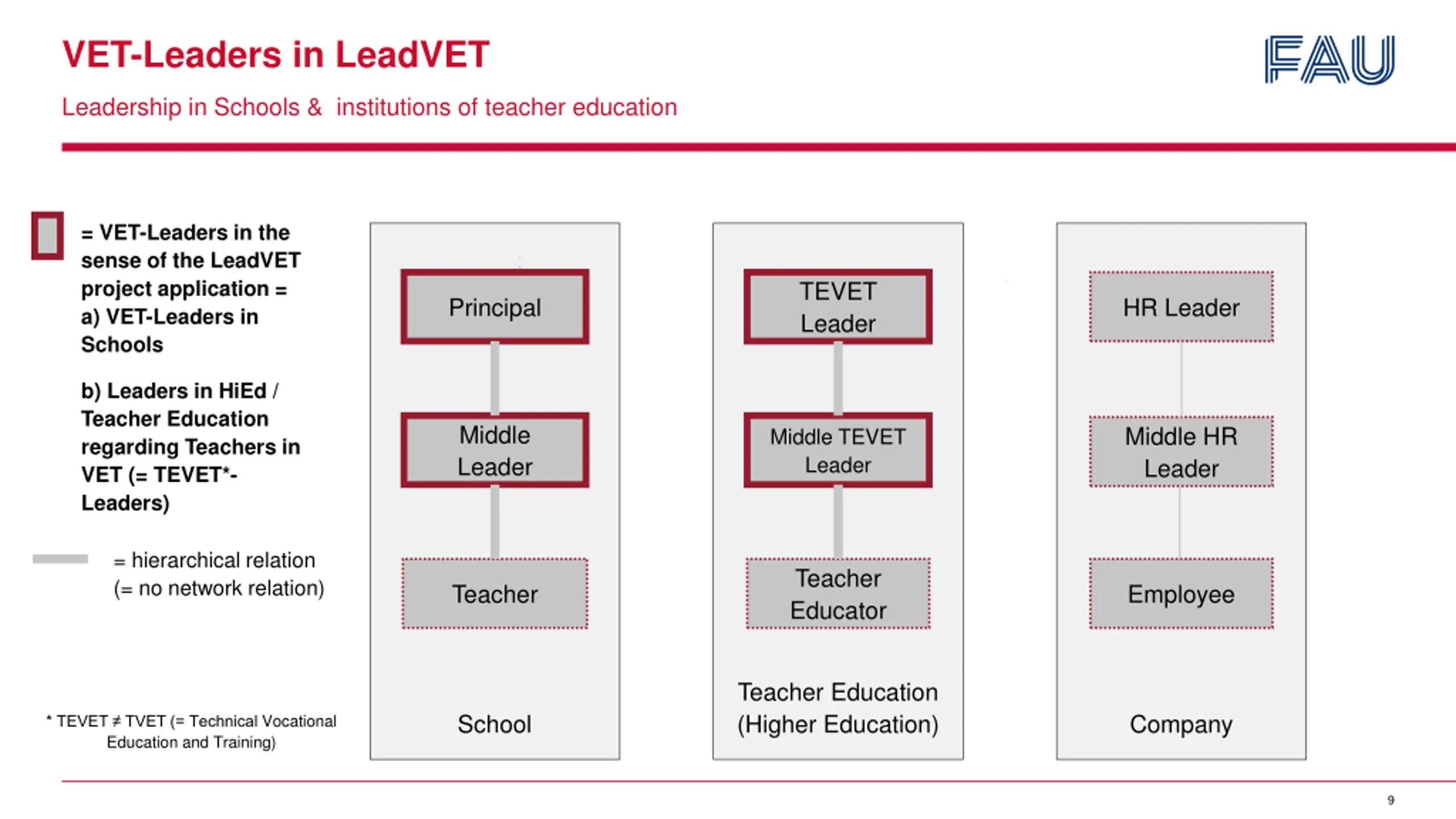 VET-Leaders in LeadVET Leadership in Schools & institutions of teacher education = VET-Leaders in the sense of the LeadVET project application = a) VET-Leaders in Schools TEVET Leader Principal HR Leader b) Leaders in HiEd / Teacher Education regarding Teachers in VET (= TEVET*- Leaders) Middle Leader Middle HR Leader Middle TEVET Leader = hierarchical relation (= no network relation) Teacher Educator Teacher Employee Teacher Education (Higher Education) School Company * TEVET TVET (= Technical Vocational Education and Training) 9