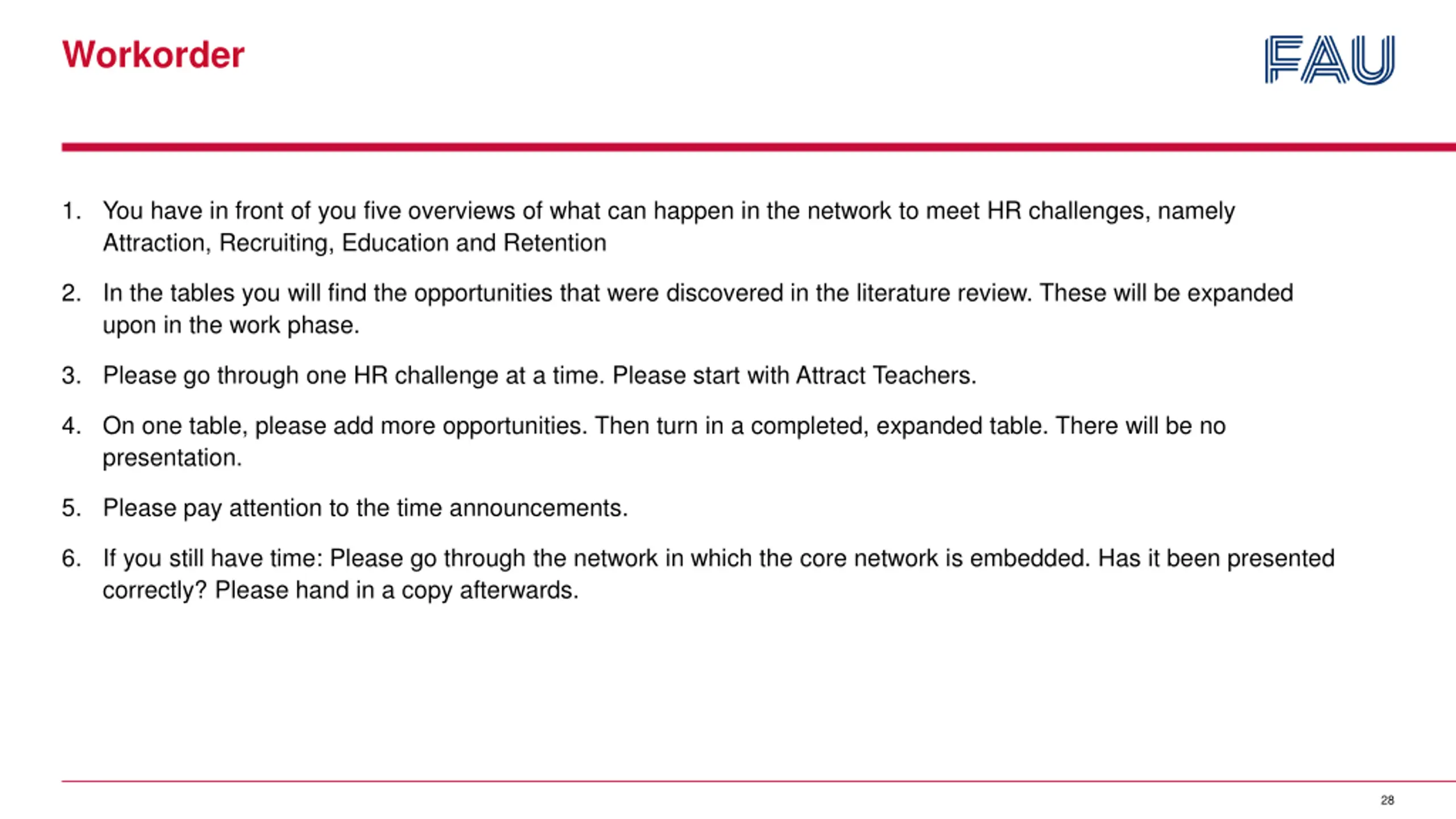 Workorder 1. You have in front of you five overviews of what can happen in the network to meet HR challenges, namely Attraction, Recruiting, Education and Retention 2. In the tables you will find the opportunities that were discovered in the literature review. These will be expanded upon in the work phase. 3. Please go through one HR challenge at a time. Please start with Attract Teachers. 4. On one table, please add more opportunities. Then turn in a completed, expanded table. There will be no presentation. 5. Please pay attention to the time announcements. 6. If you still have time: Please go through the network in which the core network is embedded. Has it been presented correctly? Please hand in a copy afterwards. 28