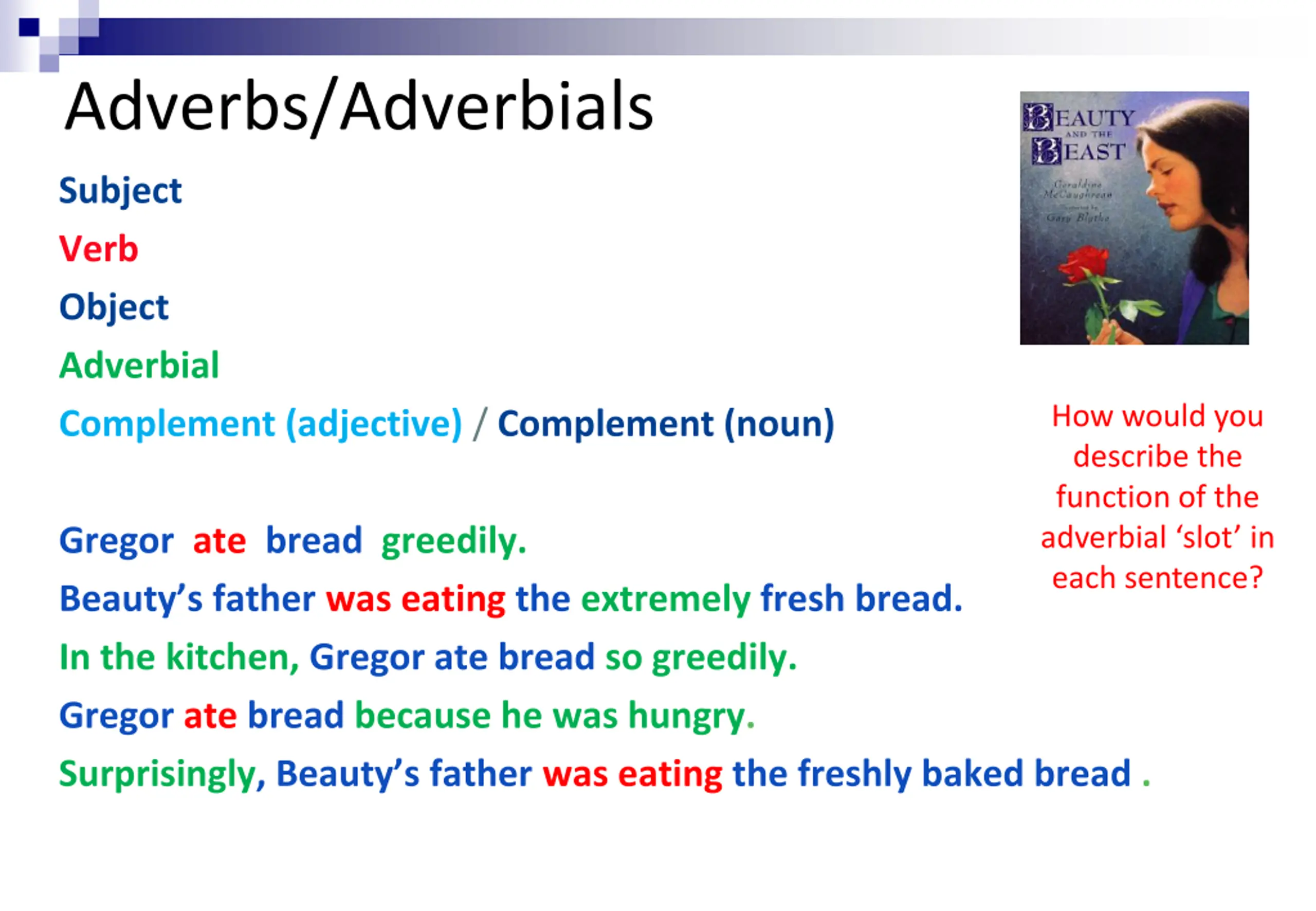 Adverbs/Adverbials Subject Verb Object Adverbial Complement (adjective) / Complement (noun) How would you describe the function of the adverbial slot in each sentence? Gregor ate bread greedily. Beauty s father was eating the extremely fresh bread. In the kitchen, Gregor ate bread so greedily. Gregor ate bread because he was hungry. Surprisingly, Beauty s father was eating the freshly baked bread .