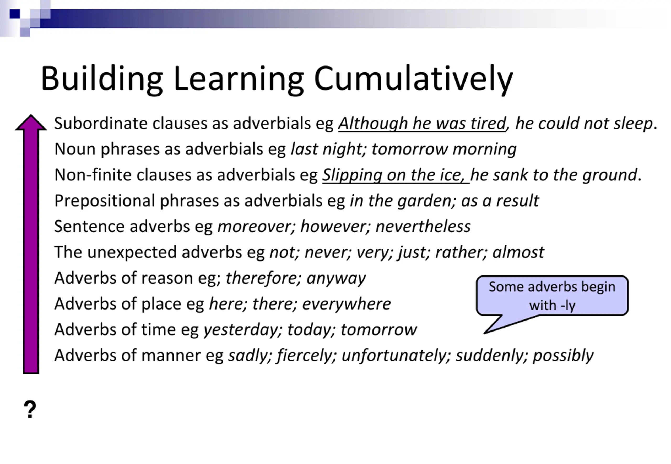 Building Learning Cumulatively Subordinate clauses as adverbials eg Although he was tired, he could not sleep. Noun phrases as adverbials eg last night; tomorrow morning Non-finite clauses as adverbials eg Slipping on the ice, he sank to the ground. Prepositional phrases as adverbials eg in the garden; as a result Sentence adverbs eg moreover; however; nevertheless The unexpected adverbs eg not; never; very; just; rather; almost Adverbs of reason eg; therefore; anyway Adverbs of place eg here; there; everywhere Adverbs of time eg yesterday; today; tomorrow Adverbs of manner eg sadly; fiercely; unfortunately; suddenly; possibly Some adverbs begin with -ly ?