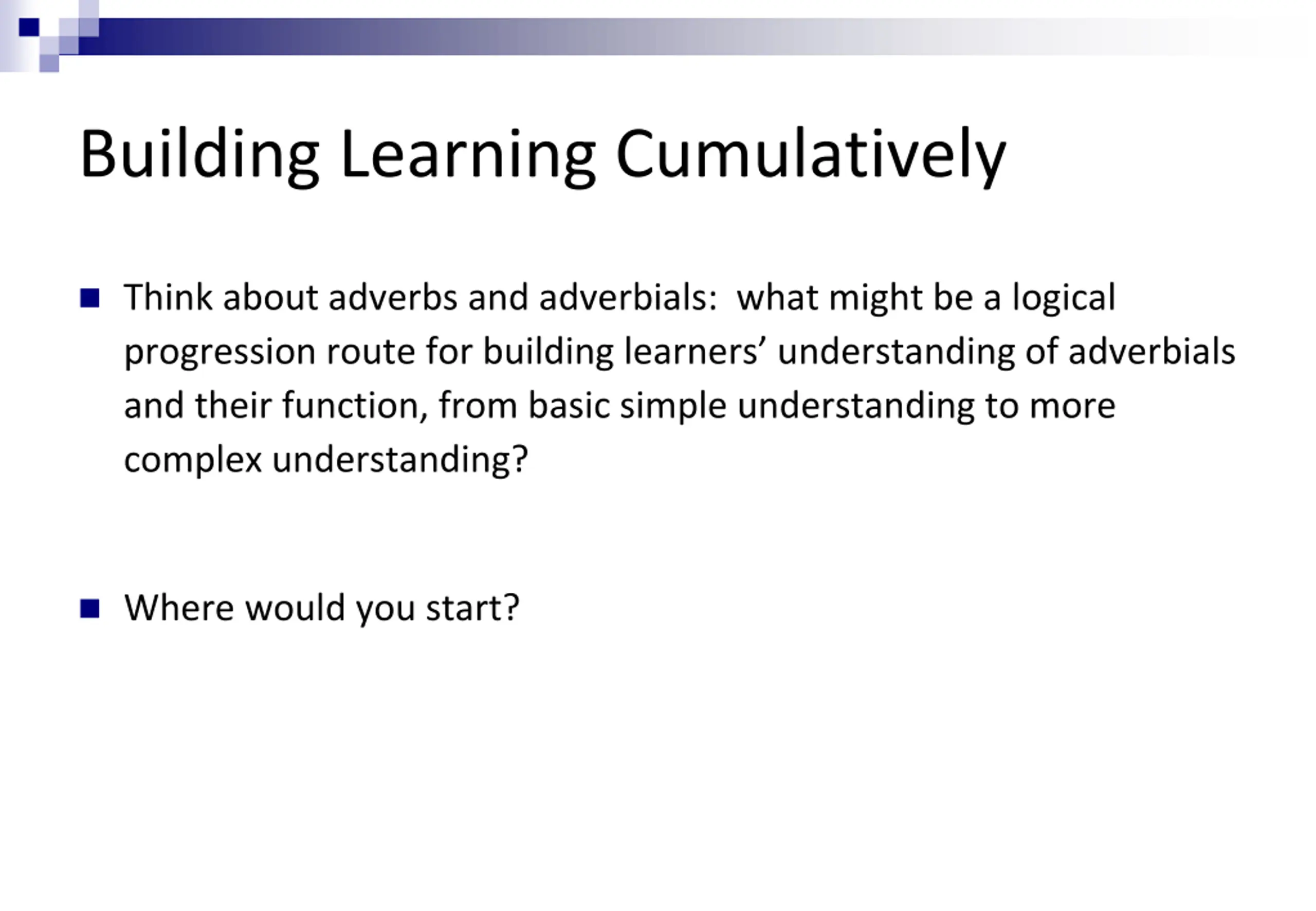 Building Learning Cumulatively Think about adverbs and adverbials: what might be a logical progression route for building learners understanding of adverbials and their function, from basic simple understanding to more complex understanding? Where would you start?