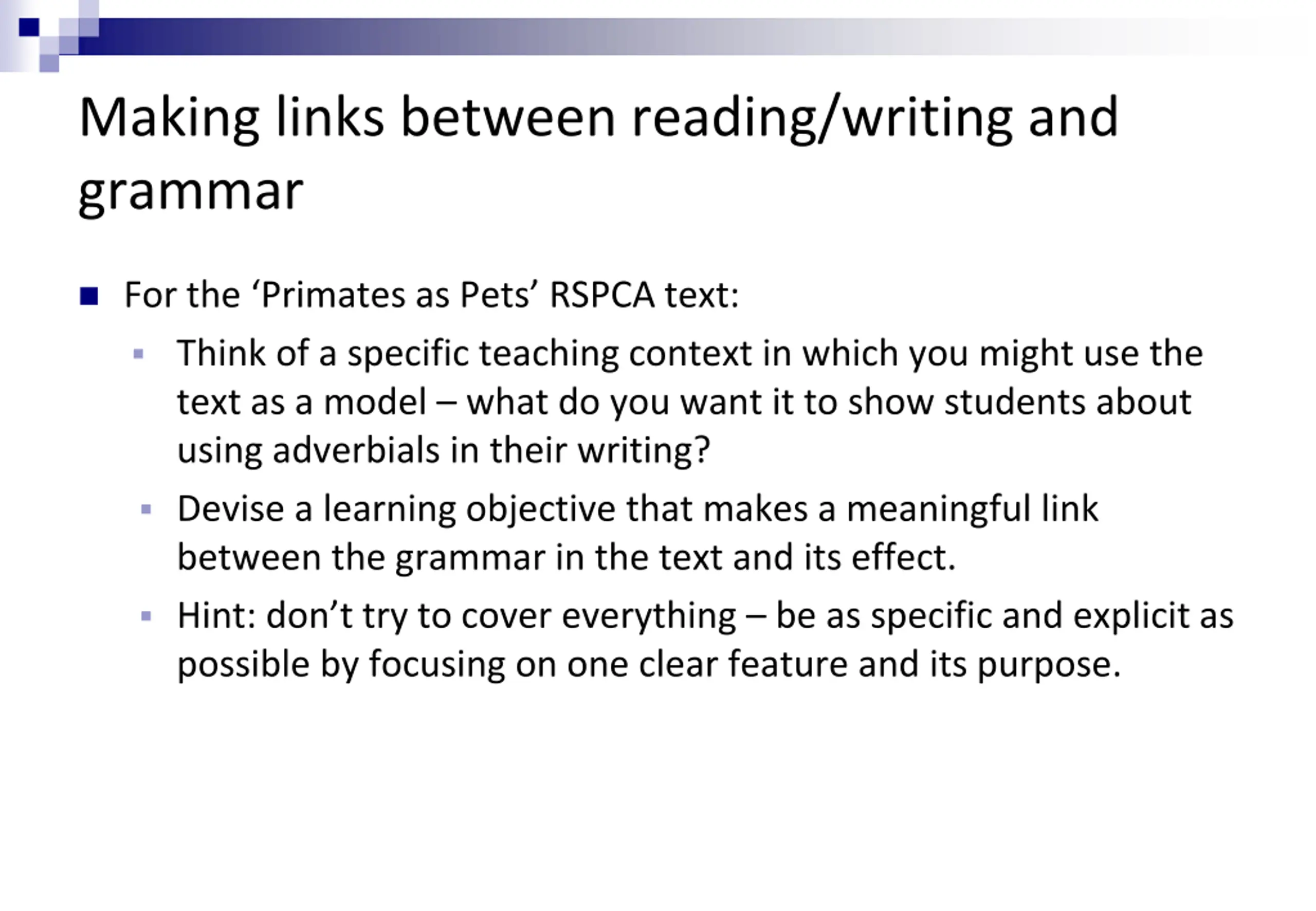 Making links between reading/writing and grammar For the Primates as Pets RSPCA text: Think of a specific teaching context in which you might use the text as a model what do you want it to show students about using adverbials in their writing? Devise a learning objective that makes a meaningful link between the grammar in the text and its effect. Hint: don t try to cover everything be as specific and explicit as possible by focusing on one clear feature and its purpose.