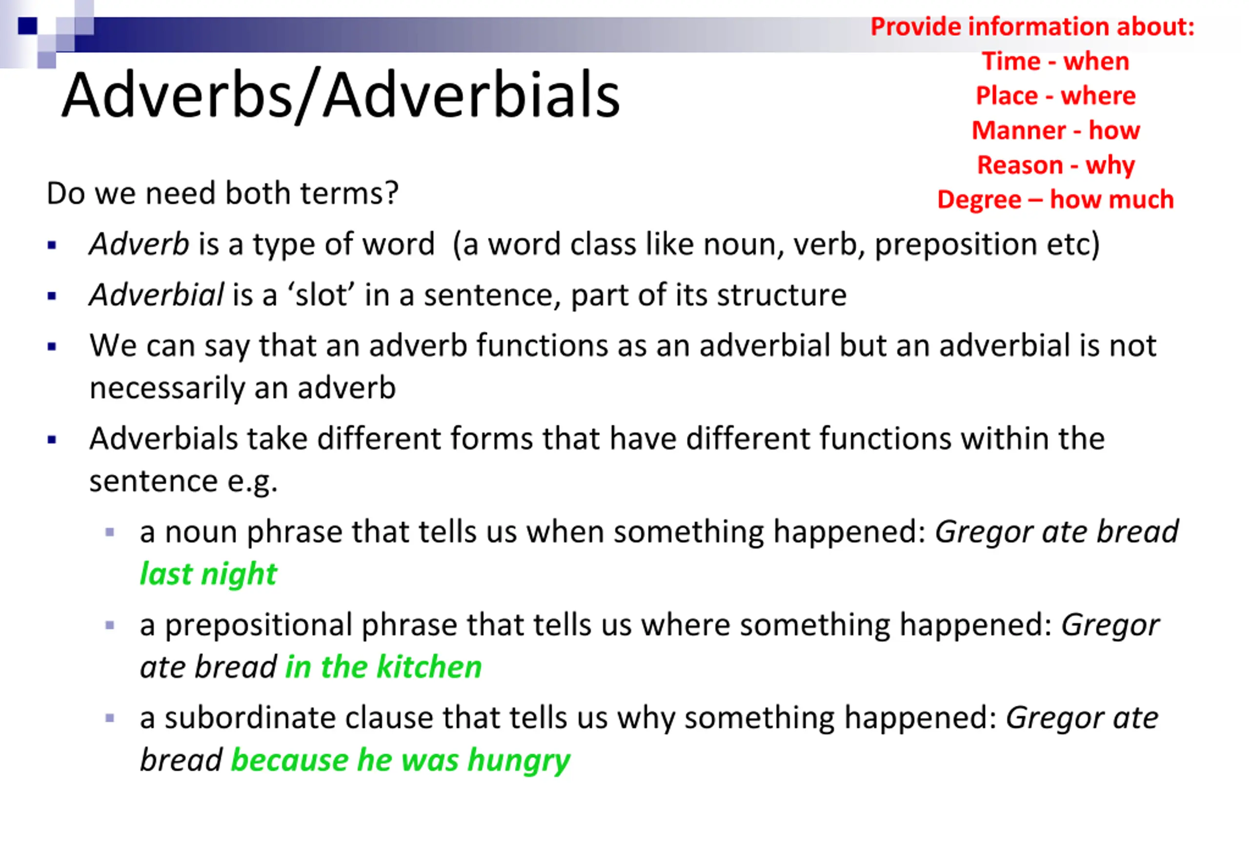 Provide information about: Time - when Place - where Manner - how Reason - why Degree how much Adverbs/Adverbials Do we need both terms? Adverb is a type of word (a word class like noun, verb, preposition etc) Adverbialis a slot in a sentence, part of its structure We can say that an adverb functions as an adverbial but an adverbial is not necessarily an adverb Adverbials take different forms that have different functions within the sentence e.g. a noun phrase that tells us when something happened: Gregor ate bread last night a prepositional phrase that tells us where something happened: Gregor ate bread in the kitchen a subordinate clause that tells us why something happened: Gregor ate bread because he was hungry