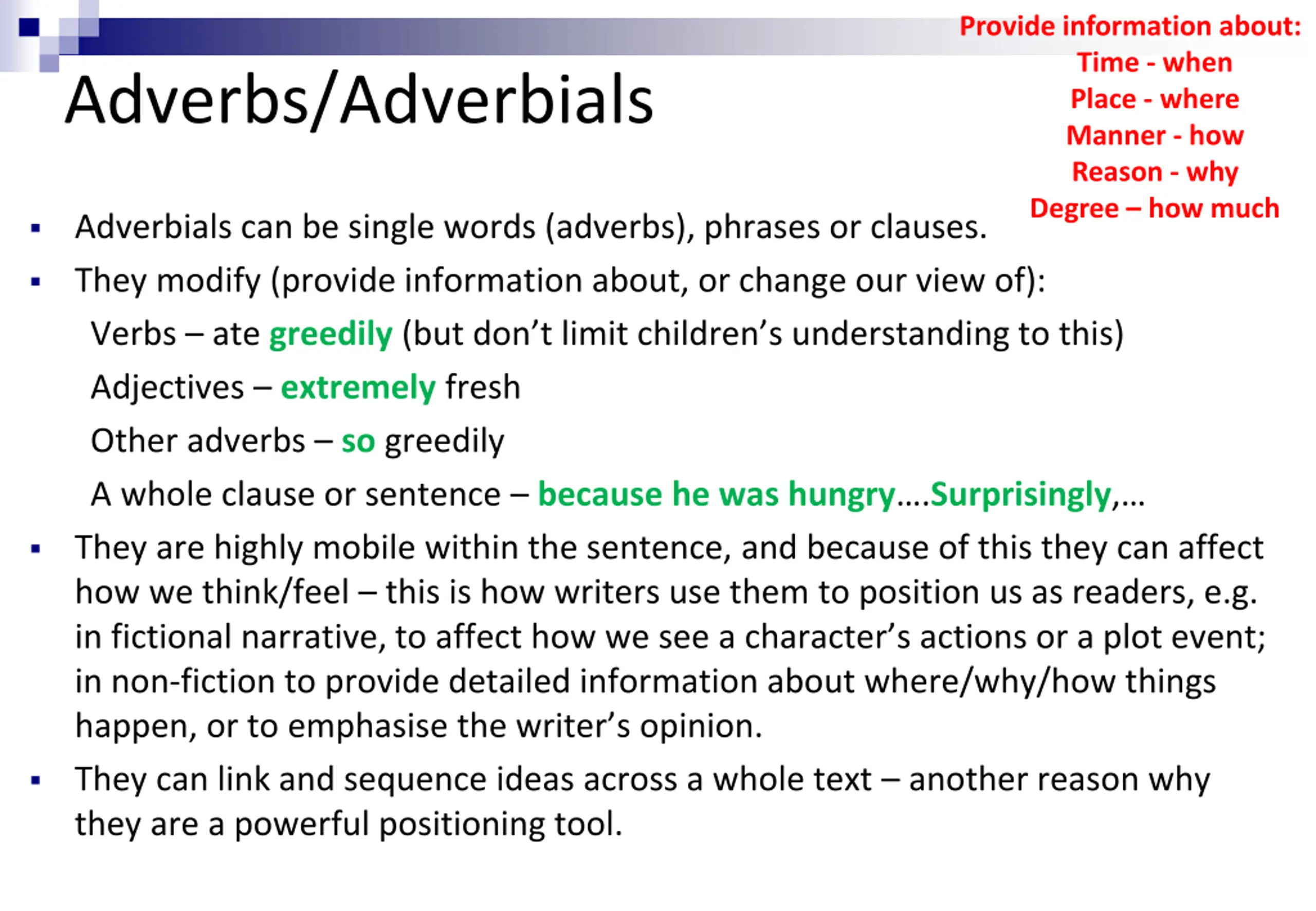 Provide information about: Time - when Place - where Manner - how Reason - why Degree how much Adverbs/Adverbials Adverbials can be single words (adverbs), phrases or clauses. They modify (provide information about, or change our view of): Verbs ate greedily(but don t limit children s understanding to this) Adjectives extremely fresh Other adverbs so greedily A whole clause or sentence because he was hungry .Surprisingly, They are highly mobile within the sentence, and because of this they can affect how we think/feel this is how writers use them to position us as readers, e.g. in fictional narrative, to affect how we see a character s actions or a plot event; in non-fiction to provide detailed information about where/why/how things happen, or to emphasise the writer s opinion. They can link and sequence ideas across a whole text another reason why they are a powerful positioning tool.