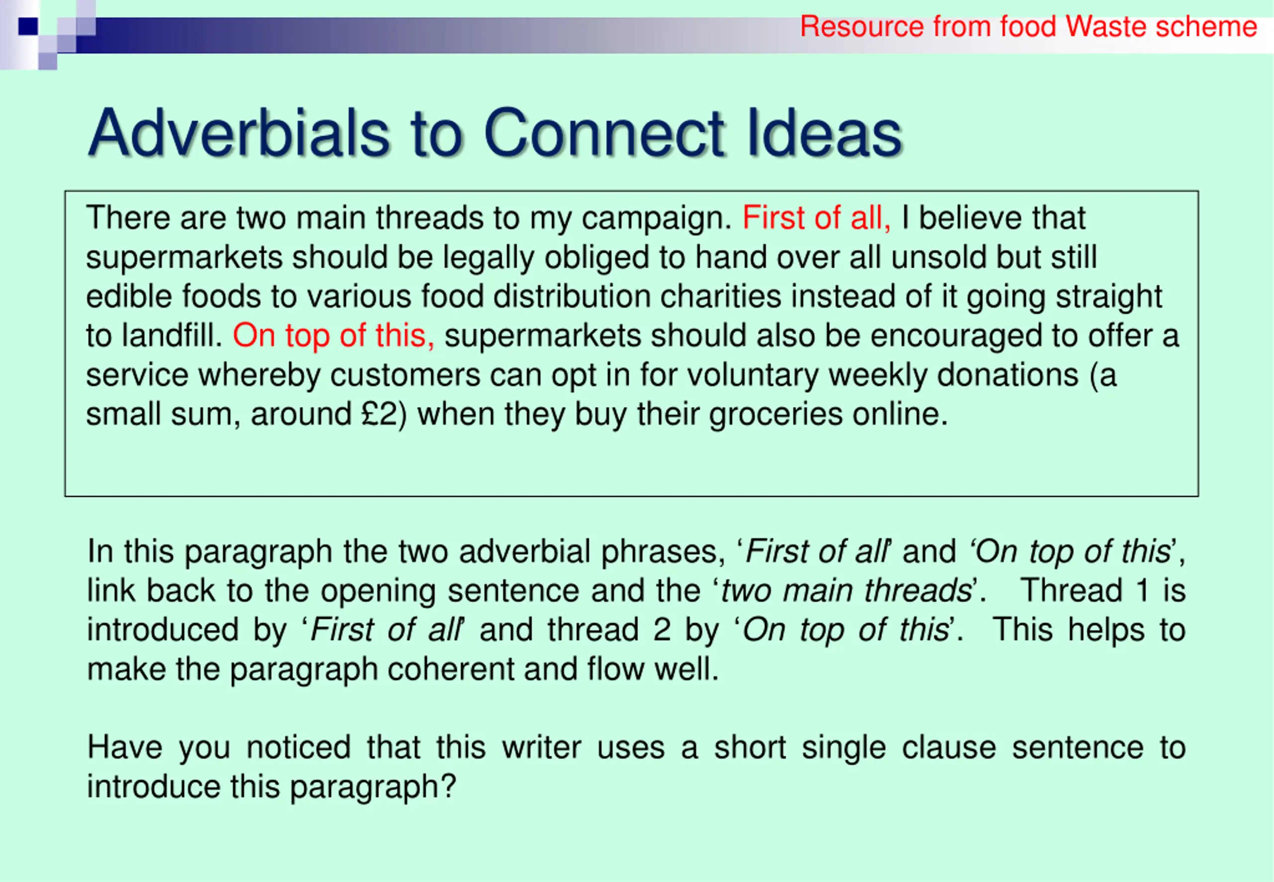 Resource from food Waste scheme Adverbials to Connect Ideas There are two main threads to my campaign. First of all, I believe that supermarkets should be legally obliged to hand over all unsold but still edible foods to various food distribution charities instead of it going straight to landfill. On top of this, supermarkets should also be encouraged to offer a service whereby customers can opt in for voluntary weekly donations (a small sum, around 2) when they buy their groceries online. In this paragraph the two adverbial phrases, First of all and On top of this , link back to the opening sentence and the two main threads . Thread 1 is introduced by First of all and thread 2 by On top of this . This helps to make the paragraph coherent and flow well. Have you noticed that this writer uses a short single clause sentence to introduce this paragraph?