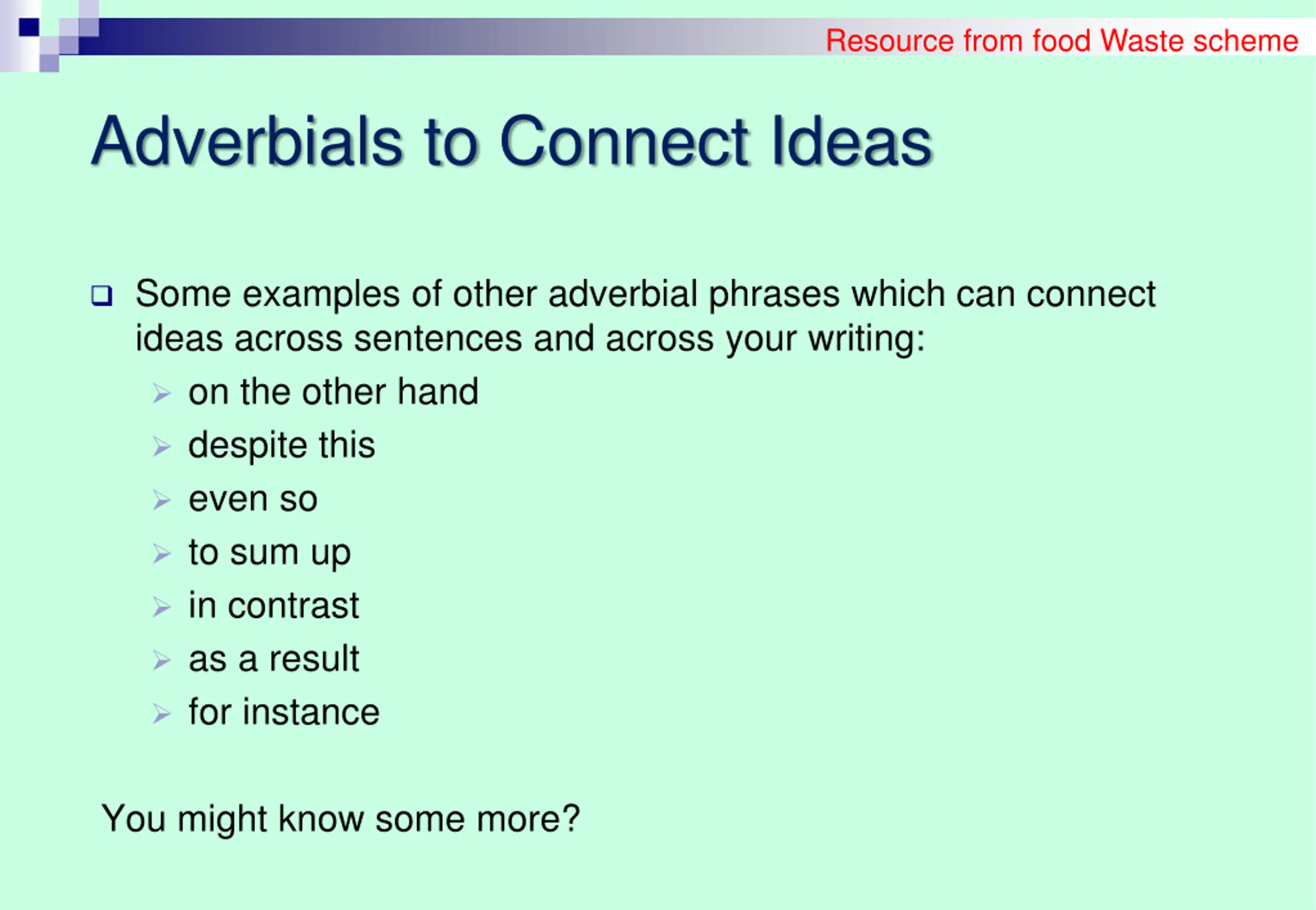 Resource from food Waste scheme Adverbials to Connect Ideas Some examples of other adverbial phrases which can connect ideas across sentences and across your writing: on the other hand despite this even so to sum up in contrast as a result for instance You might know some more?