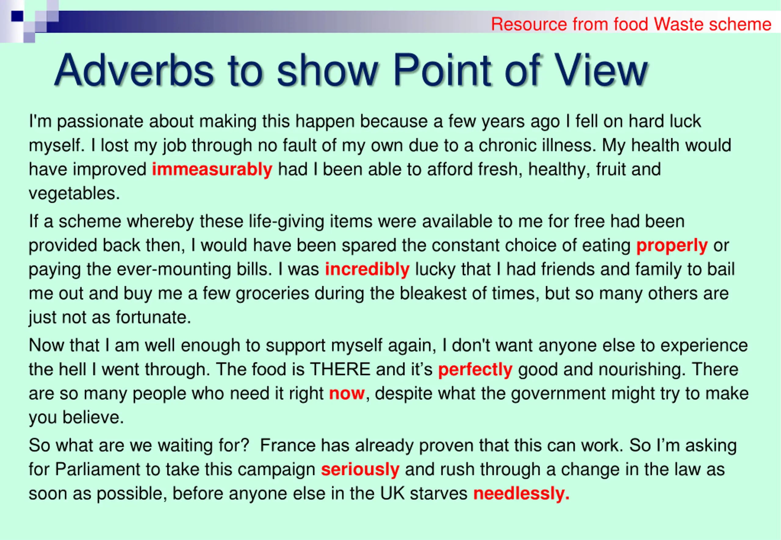 Resource from food Waste scheme Adverbs to show Point of View I'm passionate about making this happen because a few years ago I fell on hard luck myself. I lost my job through no fault of my own due to a chronic illness. My health would have improved immeasurably had I been able to afford fresh, healthy, fruit and vegetables. If a scheme whereby these life-giving items were available to me for free had been provided back then, I would have been spared the constant choice of eating properly or paying the ever-mounting bills. I was incredibly lucky that I had friends and family to bail me out and buy me a few groceries during the bleakest of times, but so many others are just not as fortunate. Now that I am well enough to support myself again, I don't want anyone else to experience the hell I went through. The food is THERE and it s perfectly good and nourishing. There are so many people who need it right now, despite what the government might try to make you believe. So what are we waiting for? France has already proven that this can work. So I m asking for Parliament to take this campaign seriously and rush through a change in the law as soon as possible, before anyone else in the UK starves needlessly.
