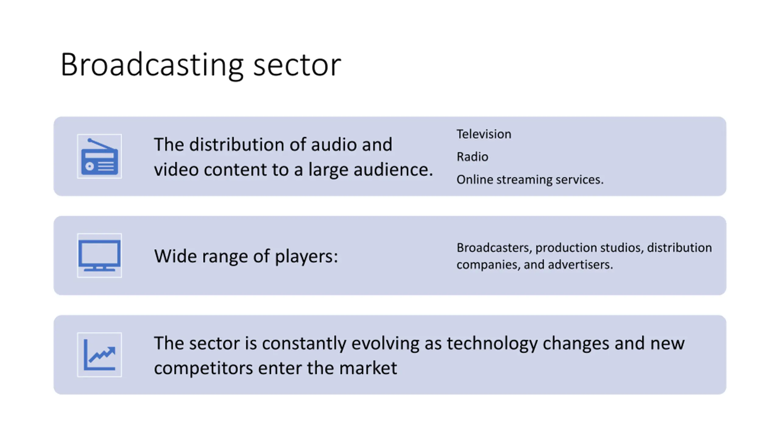 Broadcasting sector Television The distribution of audio and video content to a large audience. Radio Online streaming services. Broadcasters, production studios, distribution companies, and advertisers. Wide range of players: The sector is constantly evolving as technology changes and new competitors enter the market