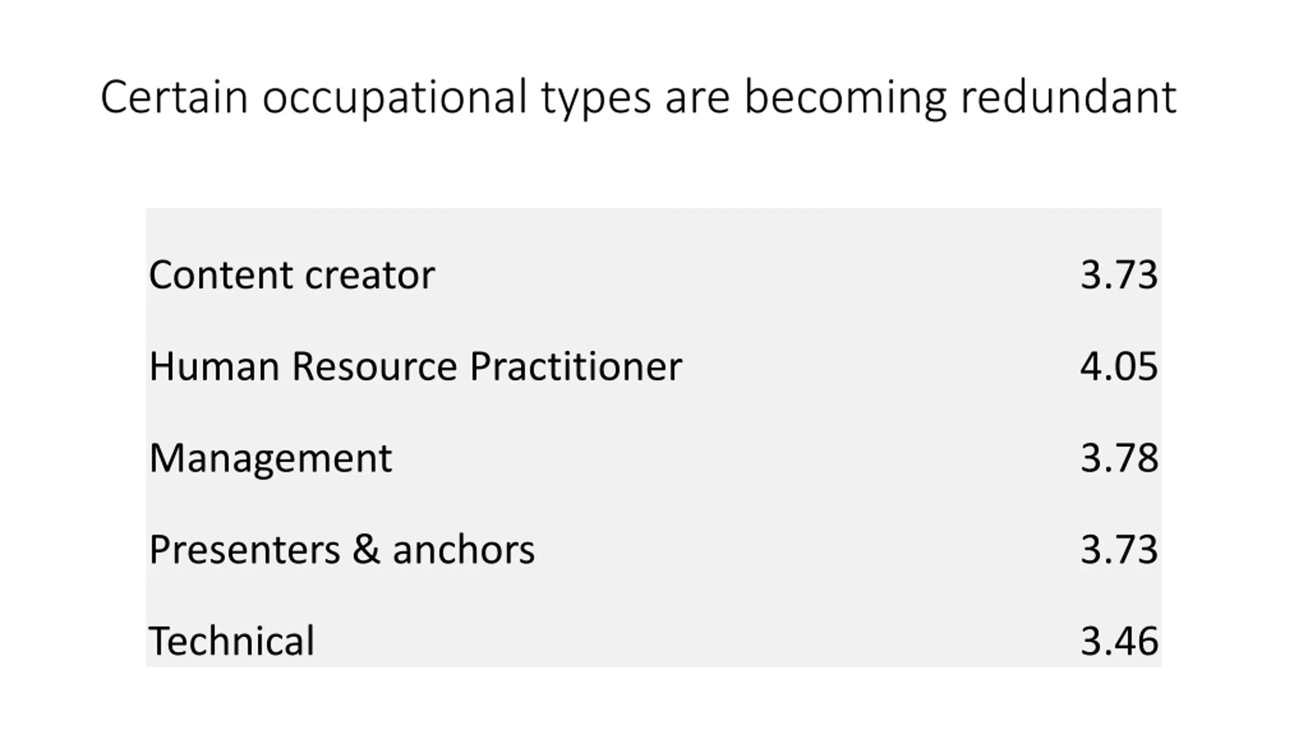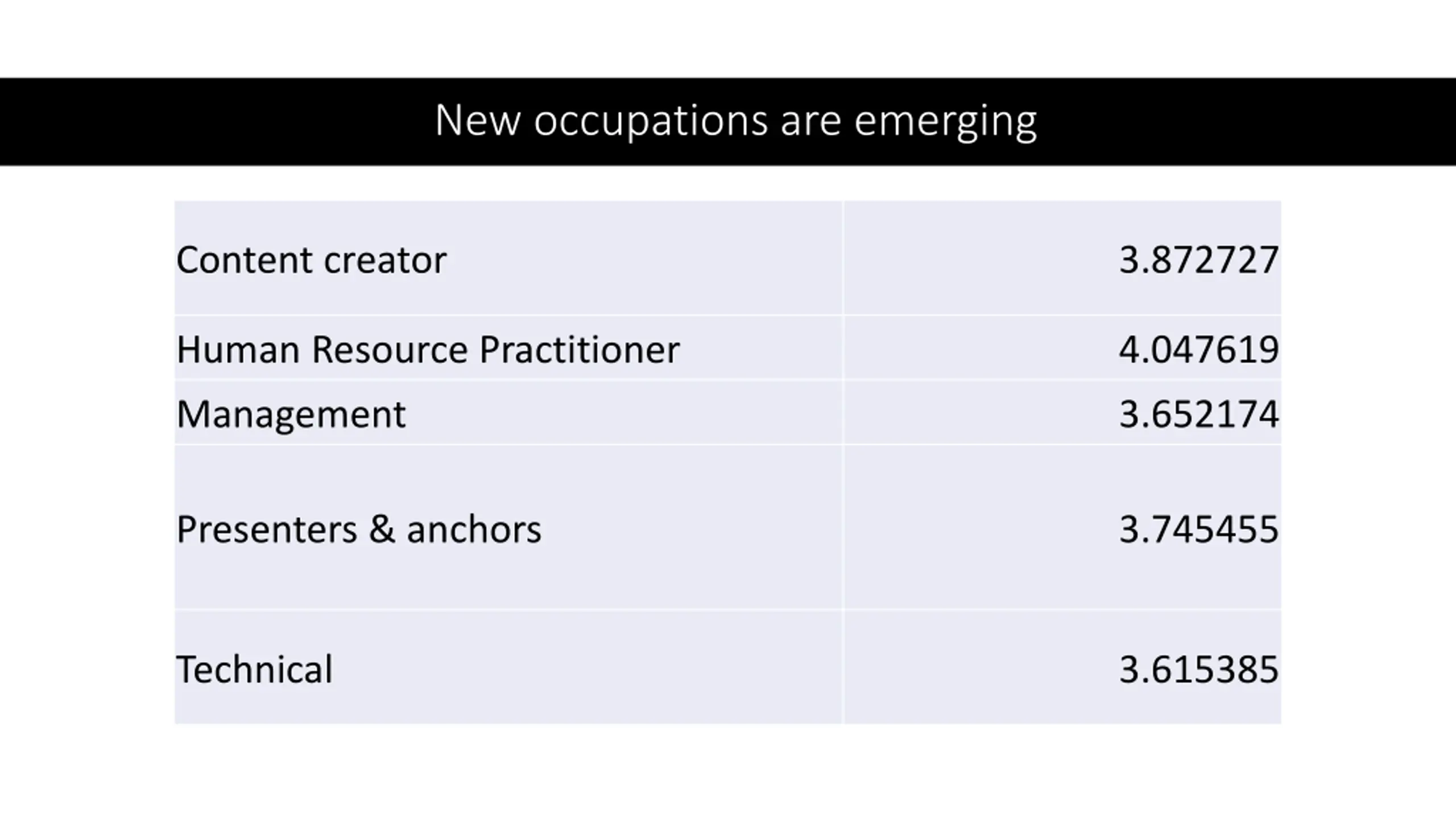 New occupations are emerging Content creator 3.872727 Human Resource Practitioner 4.047619 Management 3.652174 Presenters & anchors 3.745455 Technical 3.615385