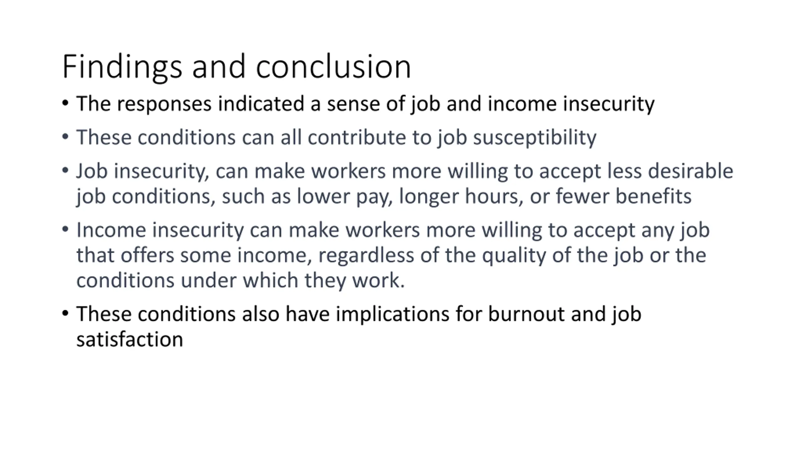 Findings and conclusion The responses indicated a sense of job and income insecurity These conditions can all contribute to job susceptibility Job insecurity, can make workers more willing to accept less desirable job conditions, such as lower pay, longer hours, or fewer benefits Income insecurity can make workers more willing to accept any job that offers some income, regardless of the quality of the job or the conditions under which they work. These conditions also have implications for burnout and job satisfaction