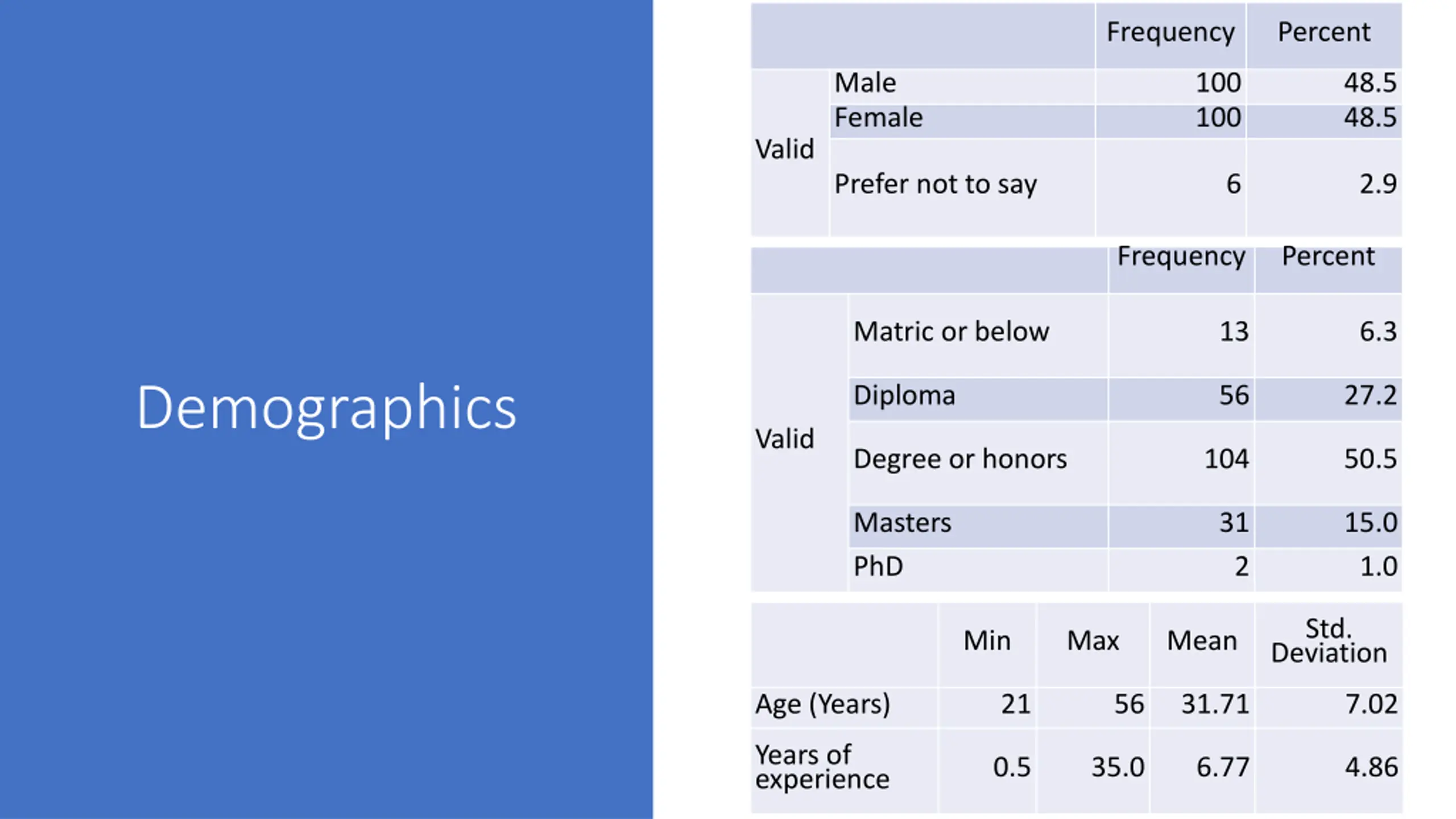 Frequency Percent Male Female 100 100 48.5 48.5 Valid Prefer not to say 6 2.9 Frequency Percent Matric or below 13 6.3 Demographics Diploma 56 27.2 Valid Degree or honors 104 50.5 Masters PhD 31 15.0 1.0 2 Std. Min Max Mean Deviation Age (Years) 21 56 31.71 7.02 Years of experience 0.5 35.0 6.77 4.86
