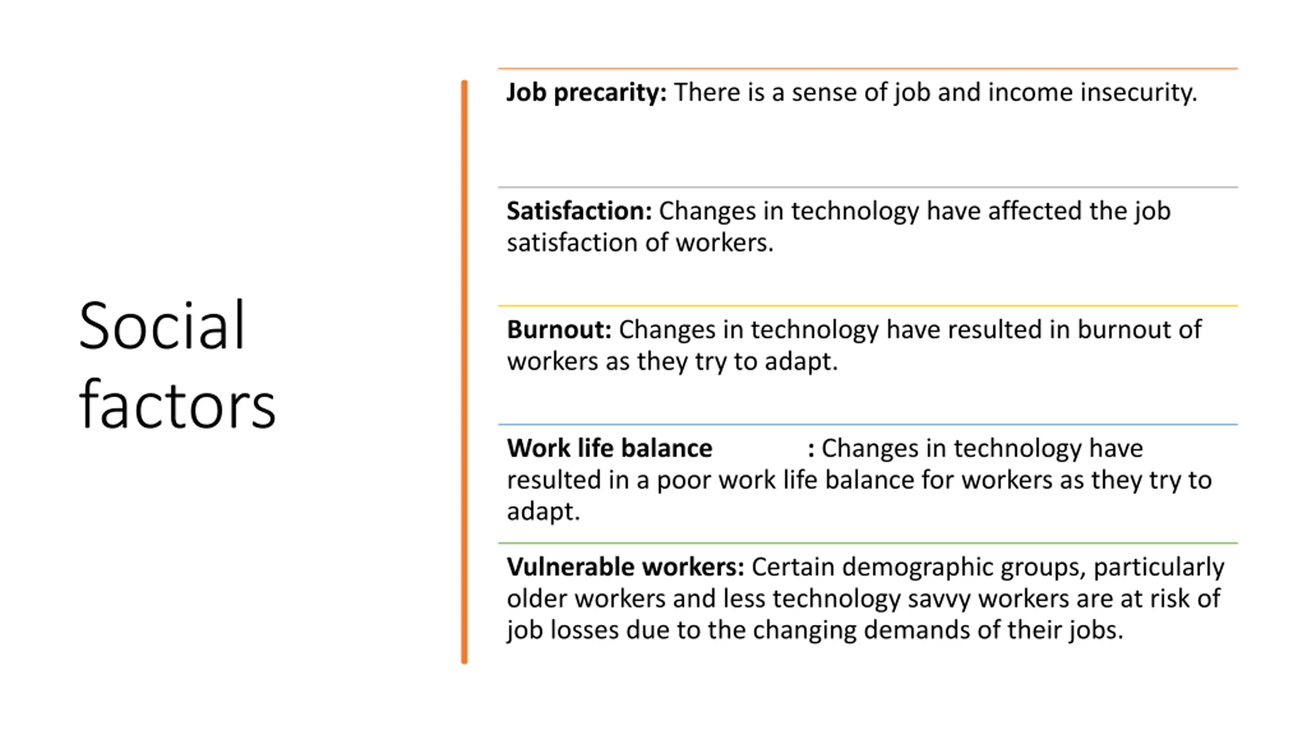 Job precarity: There is a sense of job and income insecurity. Satisfaction: Changes in technology have affected the job satisfaction of workers. Social factors Burnout: Changes in technology have resulted in burnout of workers as they try to adapt. Work life balance resulted in a poor work life balance for workers as they try to adapt. : Changes in technology have Vulnerable workers: Certain demographic groups, particularly older workers and less technology savvy workers are at risk of job losses due to the changing demands of their jobs.