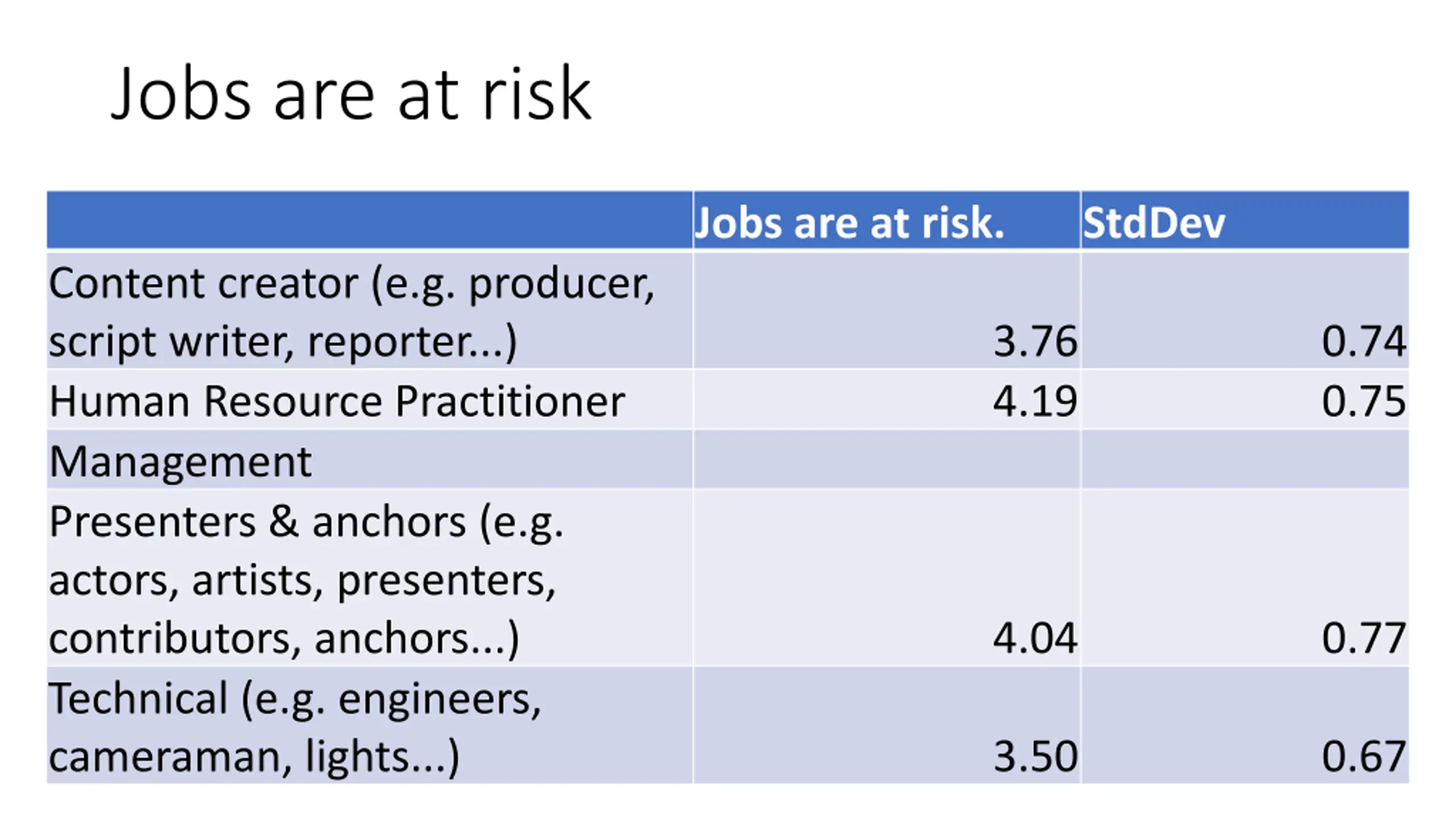Jobs are at risk Jobs are at risk. StdDev Content creator (e.g. producer, script writer, reporter...) Human Resource Practitioner Management Presenters & anchors (e.g. actors, artists, presenters, contributors, anchors...) Technical (e.g. engineers, cameraman, lights...) 3.76 4.19 0.74 0.75 4.04 0.77 3.50 0.67