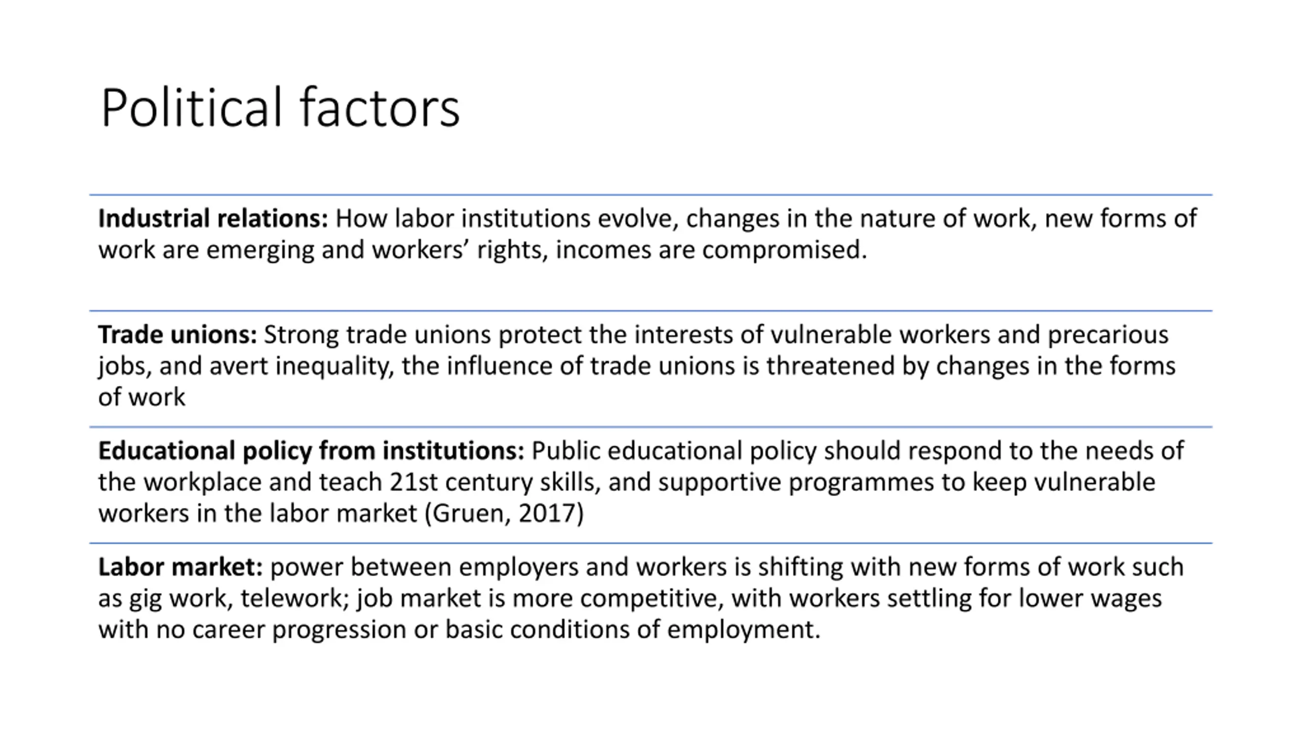 Political factors Industrial relations: How labor institutions evolve, changes in the nature of work, new forms of work are emerging and workers rights, incomes are compromised. Trade unions: Strong trade unions protect the interests of vulnerable workers and precarious jobs, and avert inequality, the influence of trade unions is threatened by changes in the forms of work Educational policy from institutions: Public educational policy should respond to the needs of the workplace and teach 21st century skills, and supportive programmes to keep vulnerable workers in the labor market (Gruen, 2017) Labor market: power between employers and workers is shifting with new forms of work such as gig work, telework; job market is more competitive, with workers settling for lower wages with no career progression or basic conditions of employment.