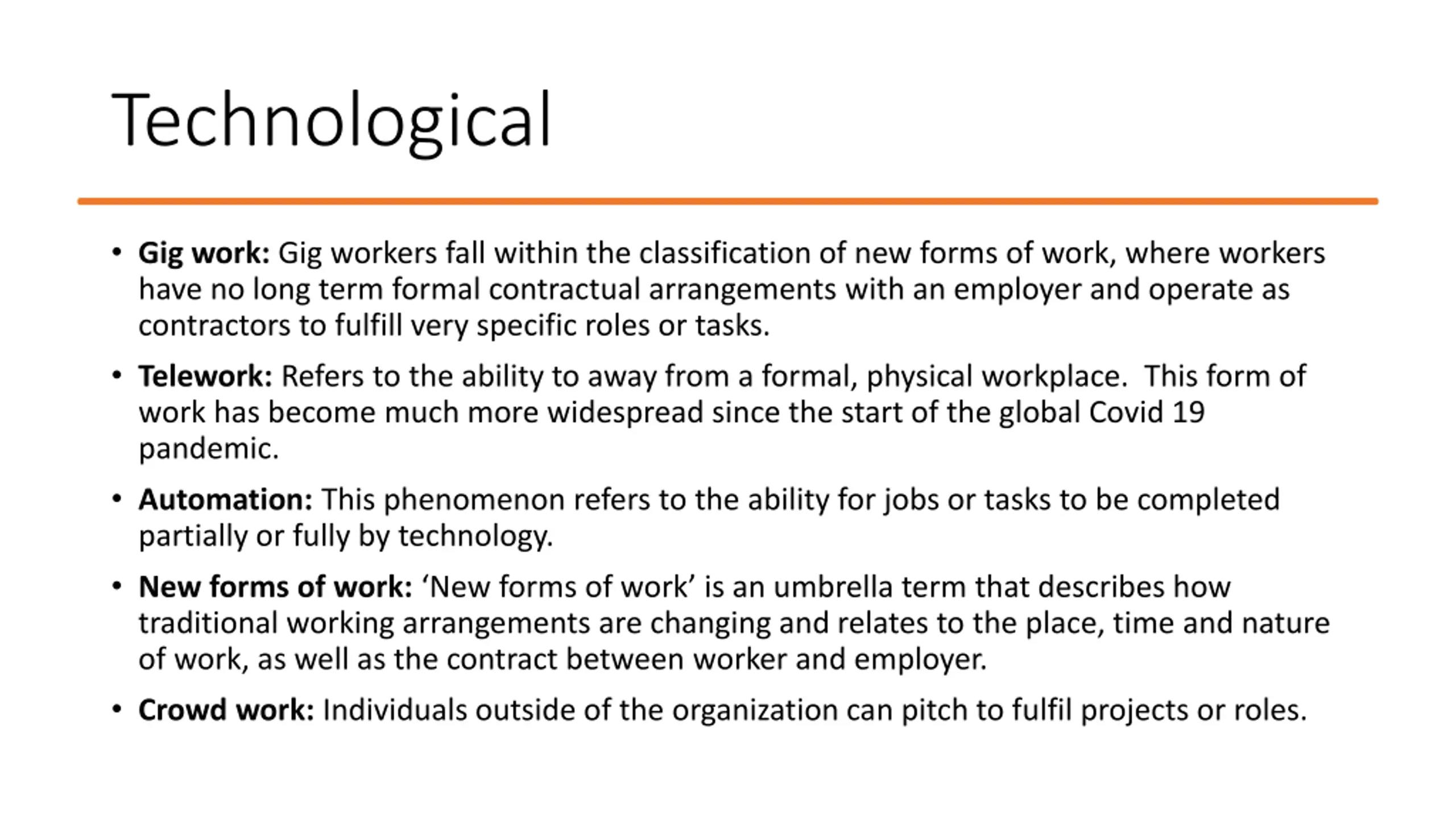 Technological Gig work: Gig workers fall within the classification of new forms of work, where workers have no long term formal contractual arrangements with an employer and operate as contractors to fulfill very specific roles or tasks. Telework: Refers to the ability to away from a formal, physical workplace. This form of work has become much more widespread since the start of the global Covid 19 pandemic. Automation: This phenomenon refers to the ability for jobs or tasks to be completed partially or fully by technology. New forms of work: New forms of work is an umbrella term that describes how traditional working arrangements are changing and relates to the place, time and nature of work, as well as the contract between worker and employer. Crowd work: Individuals outside of the organization can pitch to fulfil projects or roles.