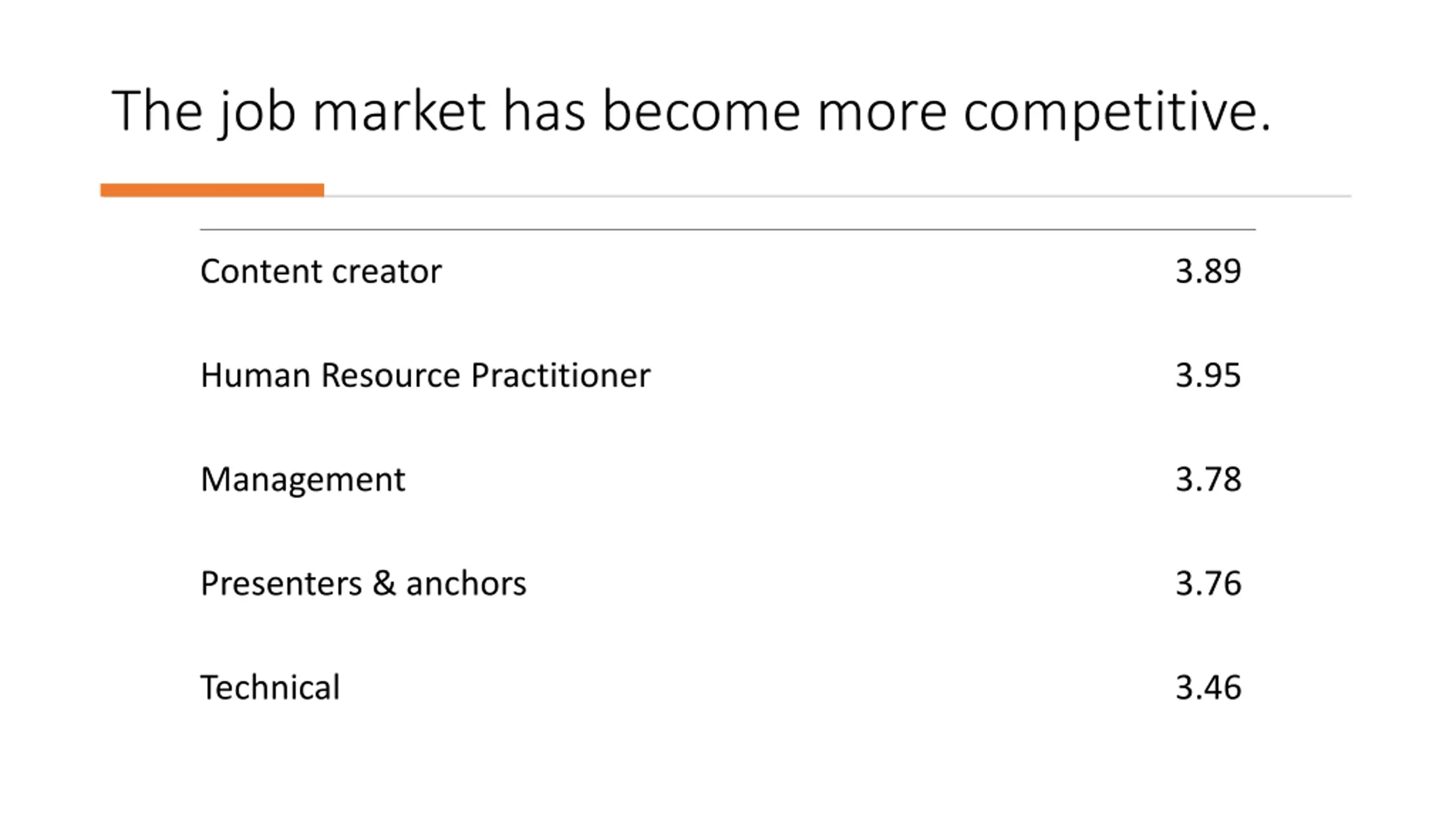 The job market has become more competitive. Content creator 3.89 Human Resource Practitioner 3.95 Management 3.78 Presenters & anchors 3.76 Technical 3.46