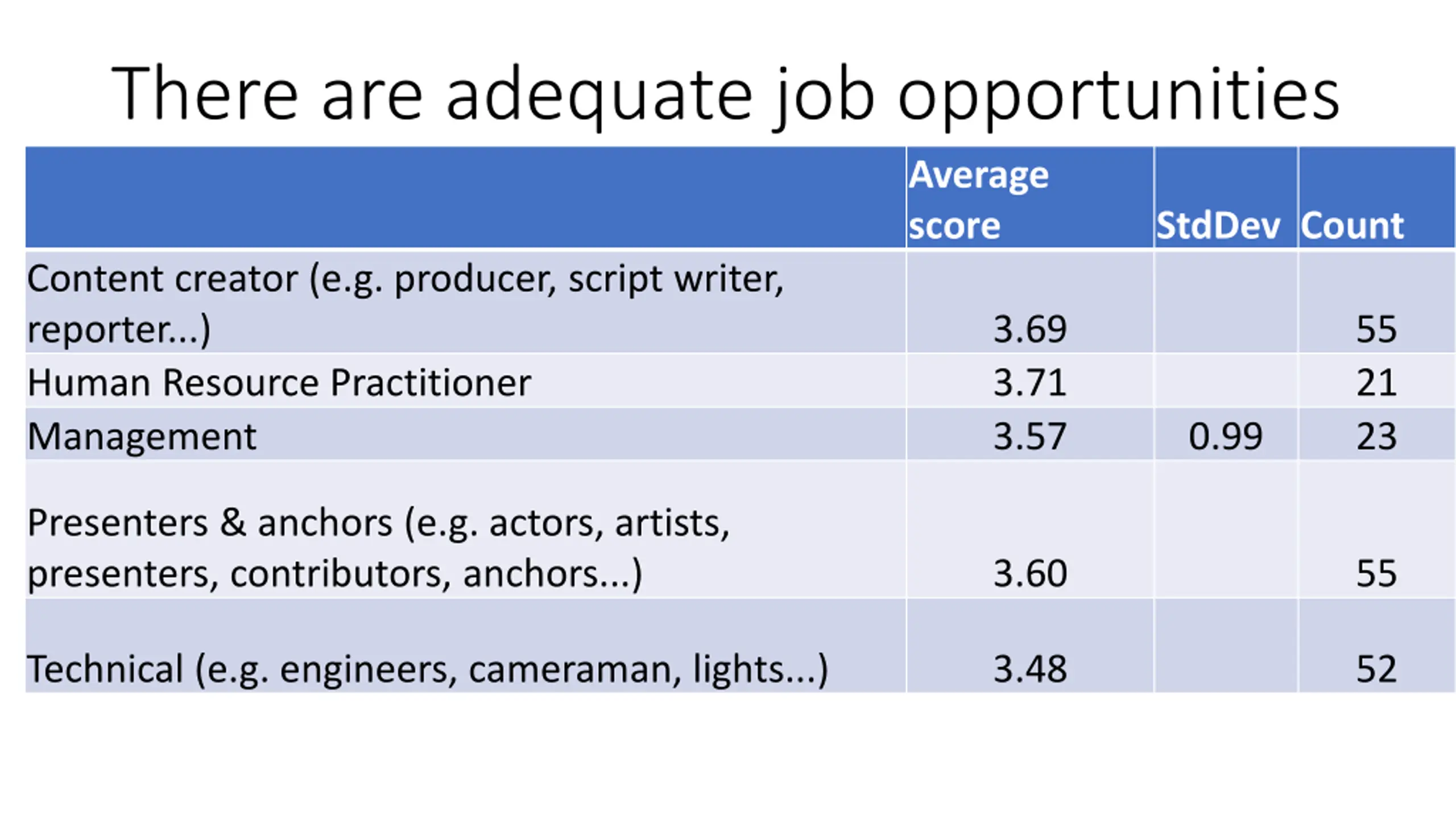 There are adequate job opportunities Average score StdDev Count Content creator (e.g. producer, script writer, reporter...) Human Resource Practitioner Management 3.69 3.71 3.57 55 21 23 0.99 Presenters & anchors (e.g. actors, artists, presenters, contributors, anchors...) 3.60 55 Technical (e.g. engineers, cameraman, lights...) 3.48 52