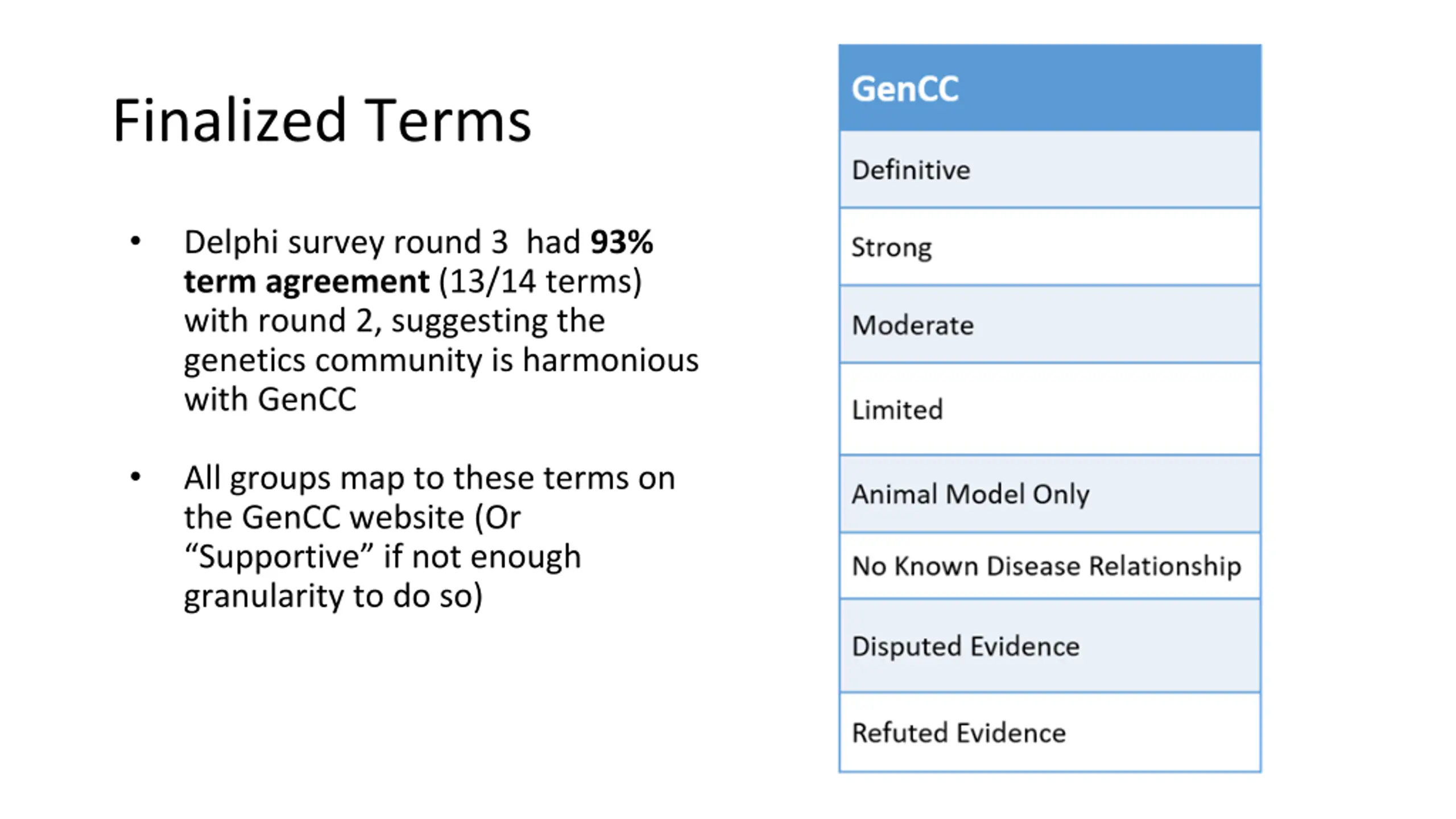 Finalized Terms Delphi survey round 3 had 93% term agreement (13/14 terms) with round 2, suggesting the genetics community is harmonious with GenCC All groups map to these terms on the GenCC website (Or Supportive if not enough granularity to do so)