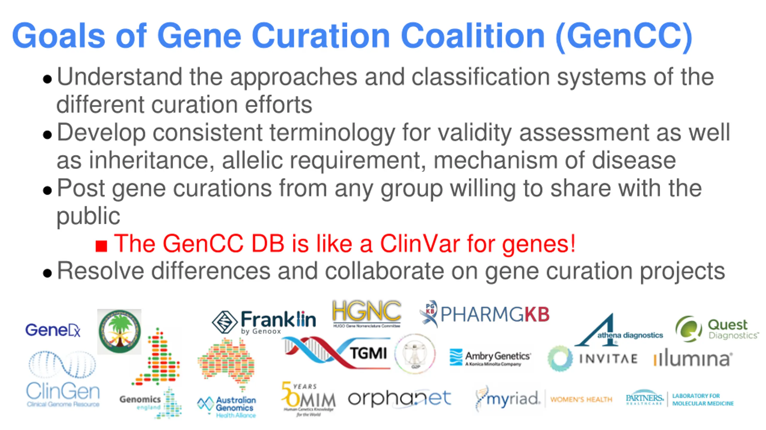 Goals of Gene Curation Coalition (GenCC) Understand the approaches and classification systems of the different curation efforts Develop consistent terminology for validity assessment as well as inheritance, allelic requirement, mechanism of disease Post gene curations from any group willing to share with the public The GenCC DB is like a ClinVar for genes! Resolve differences and collaborate on gene curation projects