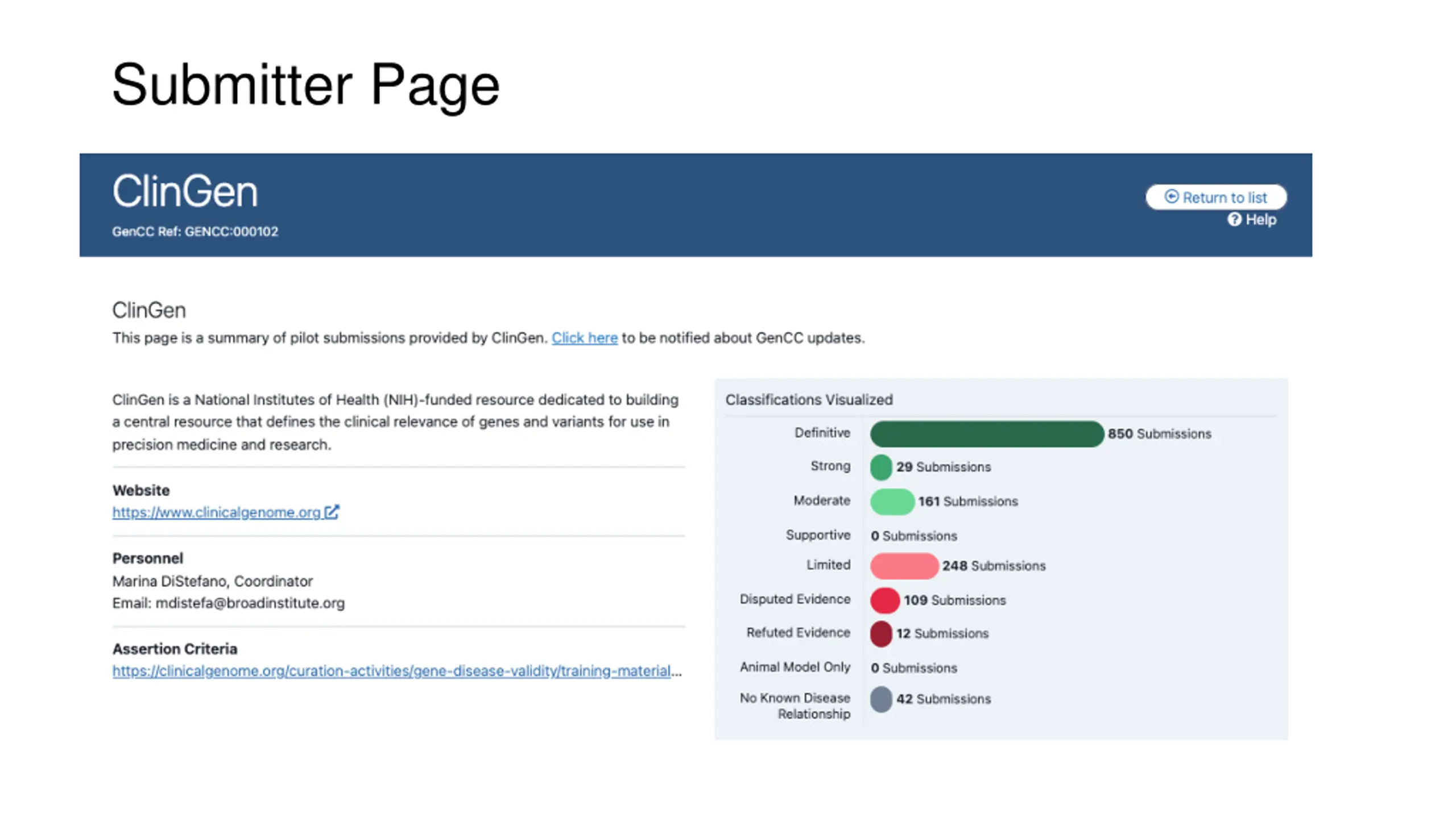 Future Enhancements API - In order to ingest OMIM data, we will be putting a submitter API in place. We are hoping to have a user API in place later in 2022. Log-in screen and dashboard for saving searches, following genes, etc. This will be similar to the ClinGen website. Disease searching flexibility: MONDO hierarchies will be incorporated into the database. This will allow users search flexibility for disease terms (search by any term in the MONDO tree, synonyms, HPO terms). This is also being discussed for the ClinGen website Granular capture of mechanism of disease Submitter that points out candidate genes in ClinVar with LP/P variants that are not in GenCC or OMIM yet