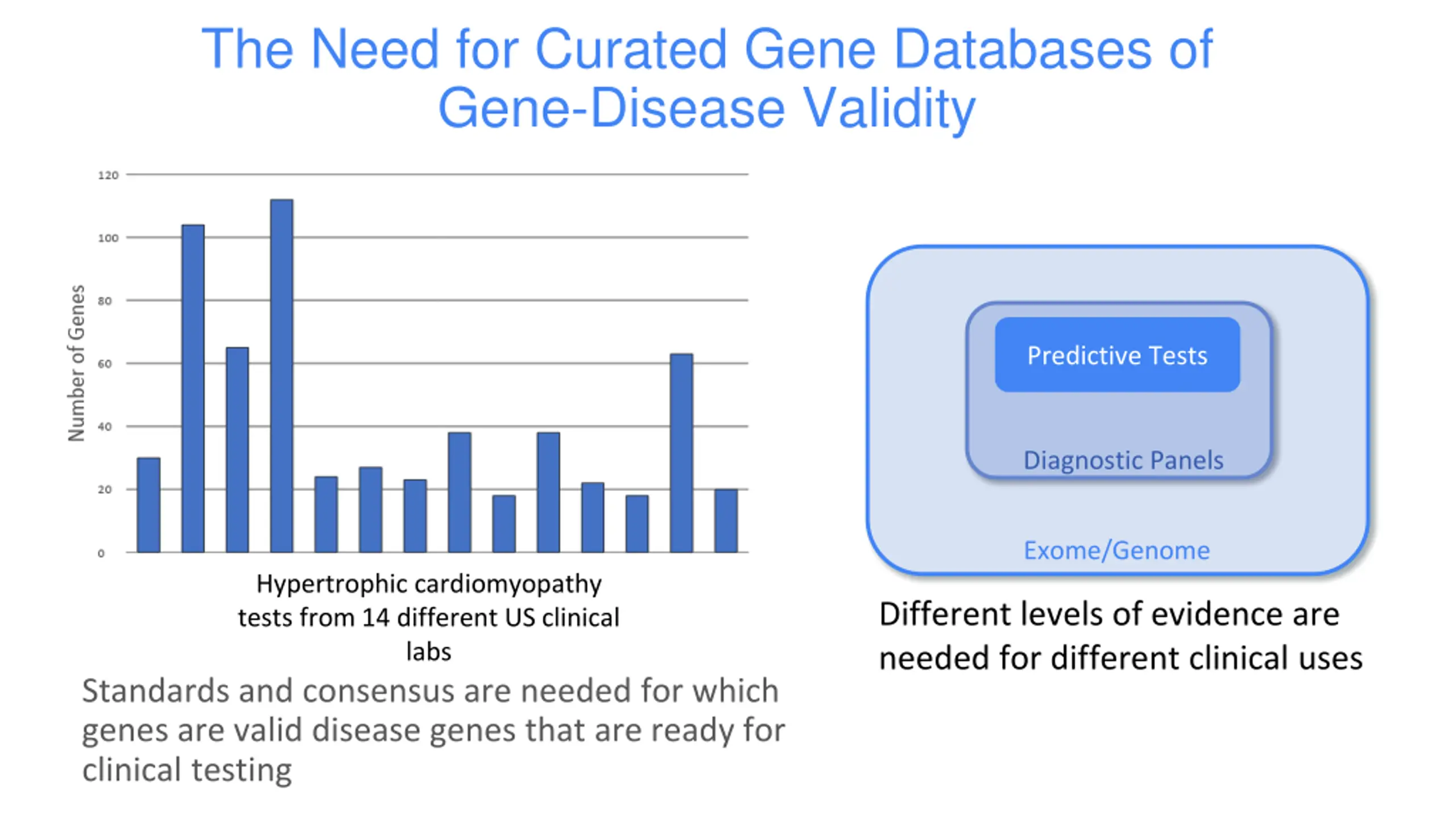 The Need for Curated Gene Databases of Gene-Disease Validity Predictive Tests Diagnostic Panels Exome/Genome Hypertrophic cardiomyopathy tests from 14 different US clinical labs Different levels of evidence are needed for different clinical uses Standards and consensus are needed for which genes are valid disease genes that are ready for clinical testing