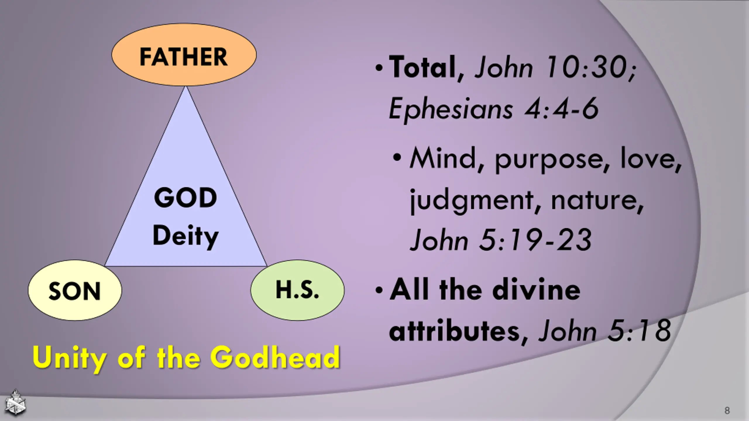 FATHER Total, John 10:30; Ephesians 4:4-6 Mind, purpose, love, judgment, nature, John 5:19-23 All the divine attributes, John 5:18 GOD Deity H.S. SON Unity of the Godhead 8