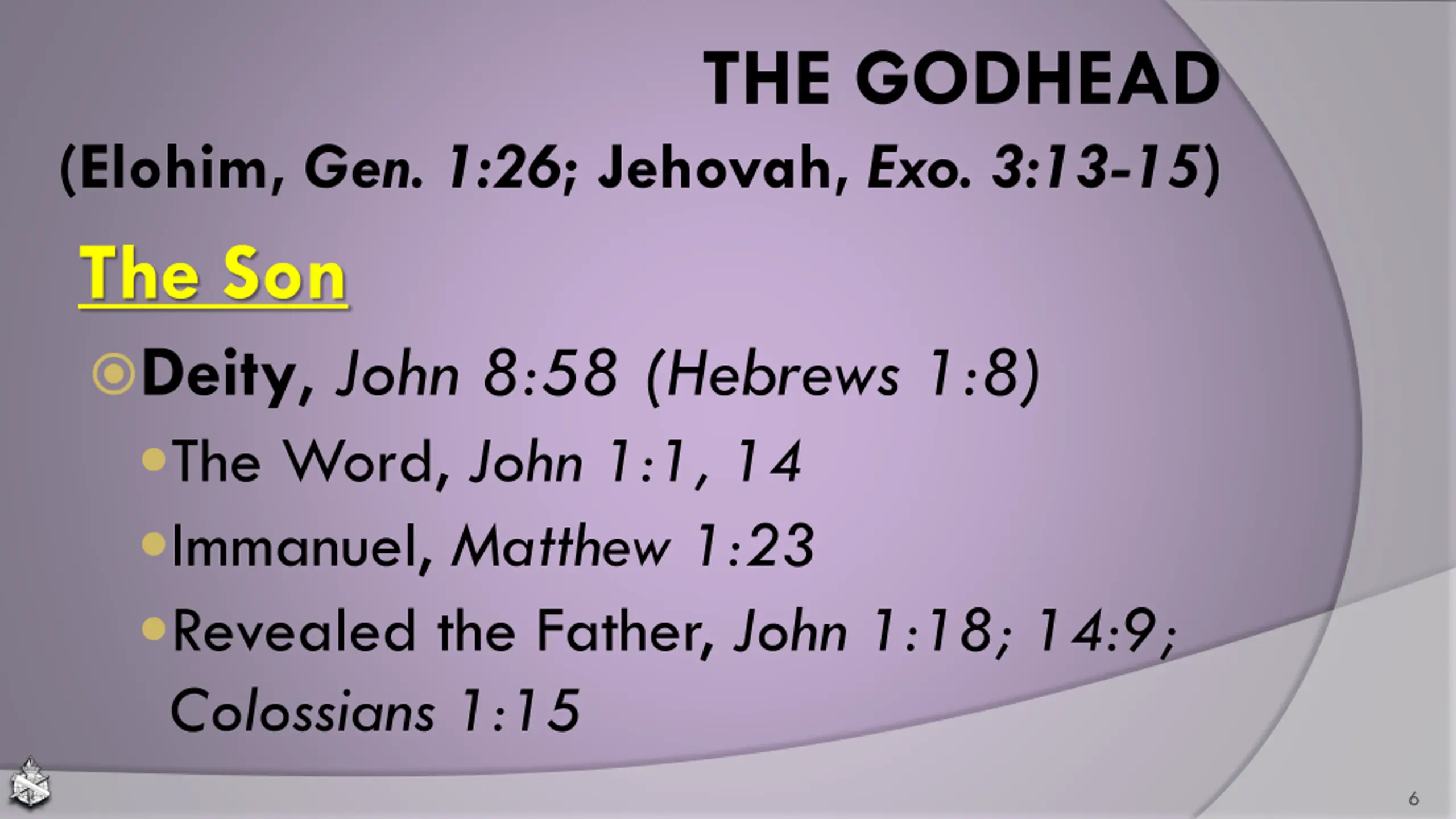 THE GODHEAD (Elohim, Gen. 1:26; Jehovah, Exo. 3:13-15) The Son Deity, John 8:58 (Hebrews 1:8) The Word, John 1:1, 14 Immanuel, Matthew 1:23 Revealed the Father, John 1:18; 14:9; Colossians 1:15 6
